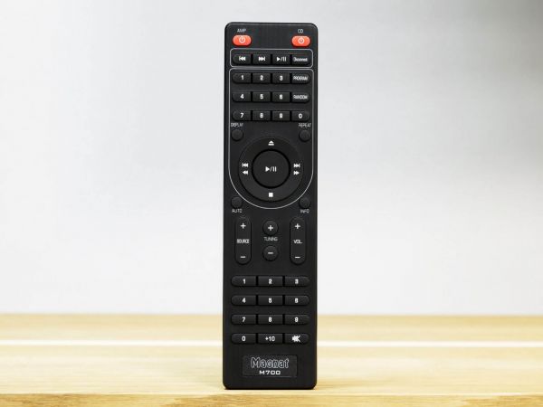 Az erősítő fémhatású műanyag lábakon áll, amelyek aljára még egy vastag gumi korongot is ragasztottak, hogy ne koptassák a készülék alatti felületet. Egyesek kifogásolhatnák, hogy csak feketében készül az MR750, de manapság egyáltalán nem szokatlan, hogy egy elektronika gyártó csak egy színopciót biztosít - ami legalább szinte mindenhez passzol. Említést érdemel az RC302 távvezérlő is, amely minden funkcióhoz hozzáférést enged. Műanyag háza miatt kicsit olcsó hatású, de találkoztunk már sokkal fapadosabb távirányítókkal, kétszer drágább készülékek tesztelésekor is. Ha a leendő tulajdonos megvásárolná a Magnat MMS 730 hálózati zenelejátszót, annak vezérlése ugyanerről a távvezérlőről is lehetséges.