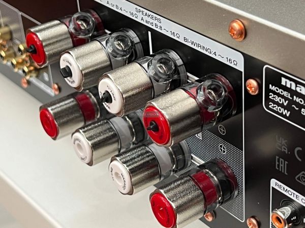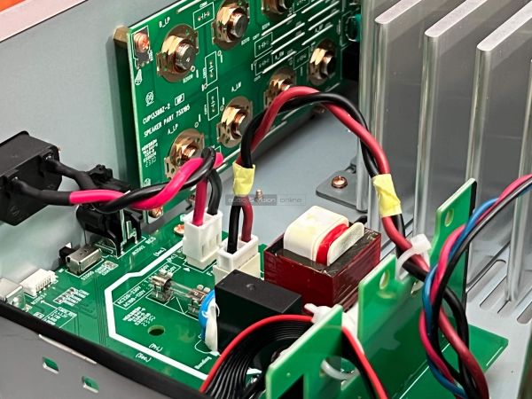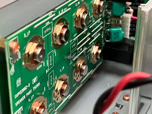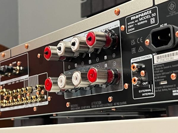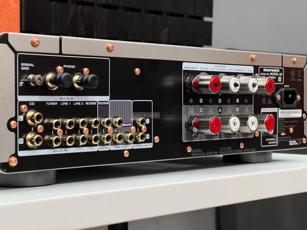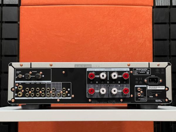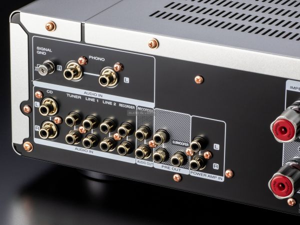 A hátlapon külön elválasztva helyezték el a földeléssel ellátott phono bemenetet, alatta pedig sorban következnek a sztereó RCA aljzatok, amelyek között recorder és subwoofer kimenetet is találunk, valamint bontható az elő és végfok. A hangfalcsatlakozók méretesek és stabilak, ahogyan említettük két pár van belőlük, mellé helyezték a tápellátás bemenetét, valamint a rendszerbe csatlakozás lehetőségét is. A négy darab széles lábon nyugvó készülék kivitelezése precíz, a megszokott rézbevonatú csavarokat is megtaláljuk, és a belsejébe tekintve is átgondolt kivitelezés fogad minket.