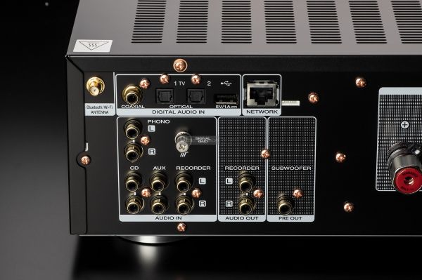 Hátul is minden igényt kielégít a választék, két antenna (WiFi/Bluetooth), phono bemenet vinyl lemezjátszóhoz, egy földelés, egy digitális koaxiális és két optikai, USB-A, Ethernet, két vonalszintű RCA, két Recorder In-Out csatlakozó, ha valaki magnót szeretne használni és egy mélysugárzó kimenet (40/60/80/100/120 Hz) választható mélyáteresztő frekvenciával.