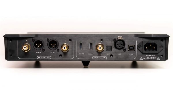 Annyi baj legyen, talán nem ezen múlik a világ - és az Aquarius - sorsa, lássuk, mit kínál a hátoldal! Mindjárt jobb kedvre derültünk látva az RCA és XLR kimeneteket (hozzátéve, hogy mivel megosztottan használják az Aquarius erőforrásait, egyszerre nem javasolt bekötni őket, ami az azonnali váltással történő összehasonlítást ellehetetleníti - de ez legyen a legnagyobb gondunk. Ezektől jobbra sorakoznak a digitális bemenetek: 2 db I2S csatlakozó (amik bár pontosan úgy néznek ki, mint egy normál HDMI, hangsúlyozottan NEM azonosak vele, így normál HDMI kábel itt nem használható), továbbá koaxiális, optikai, AES és USB-B csatlakozókat is. Ezzel a kínálattal igazán elégedettek voltunk, nehéz lenne olyan forráseszközt találni, ami nem tud csatlakozni az Aquarius-hoz. Mindezeken túlmenően még egy IEC tápcsatlakozót találtunk a hátoldalon.