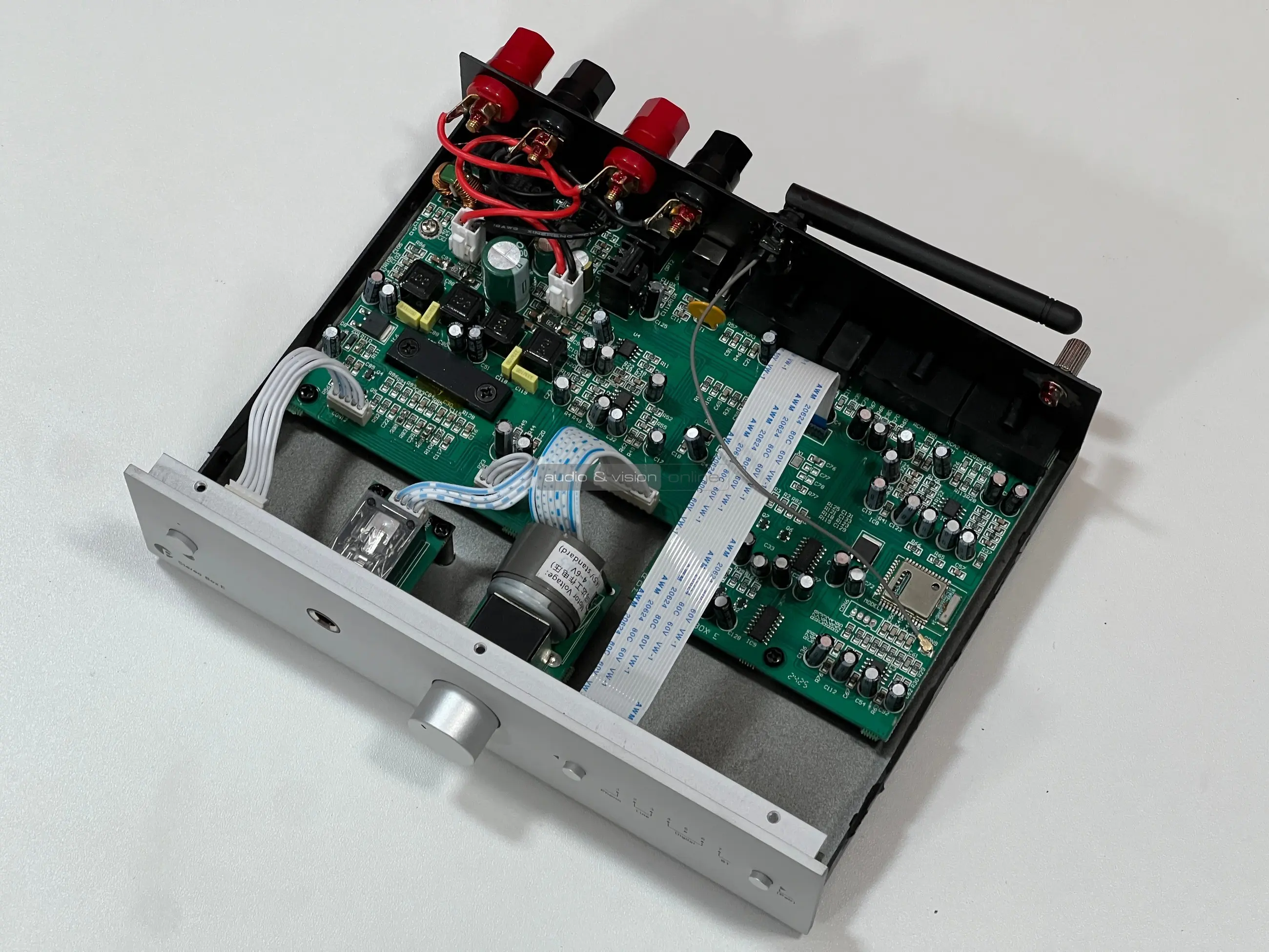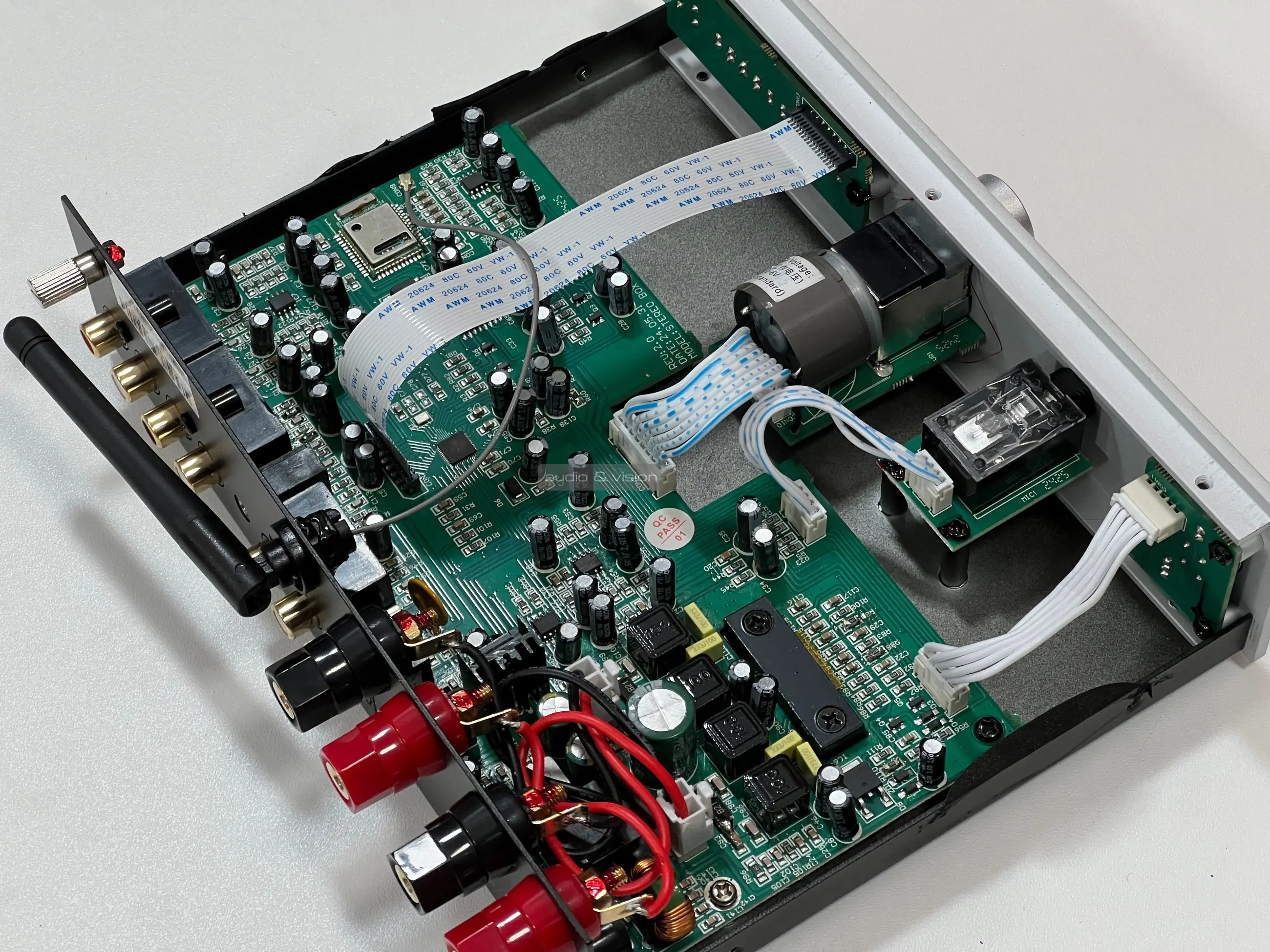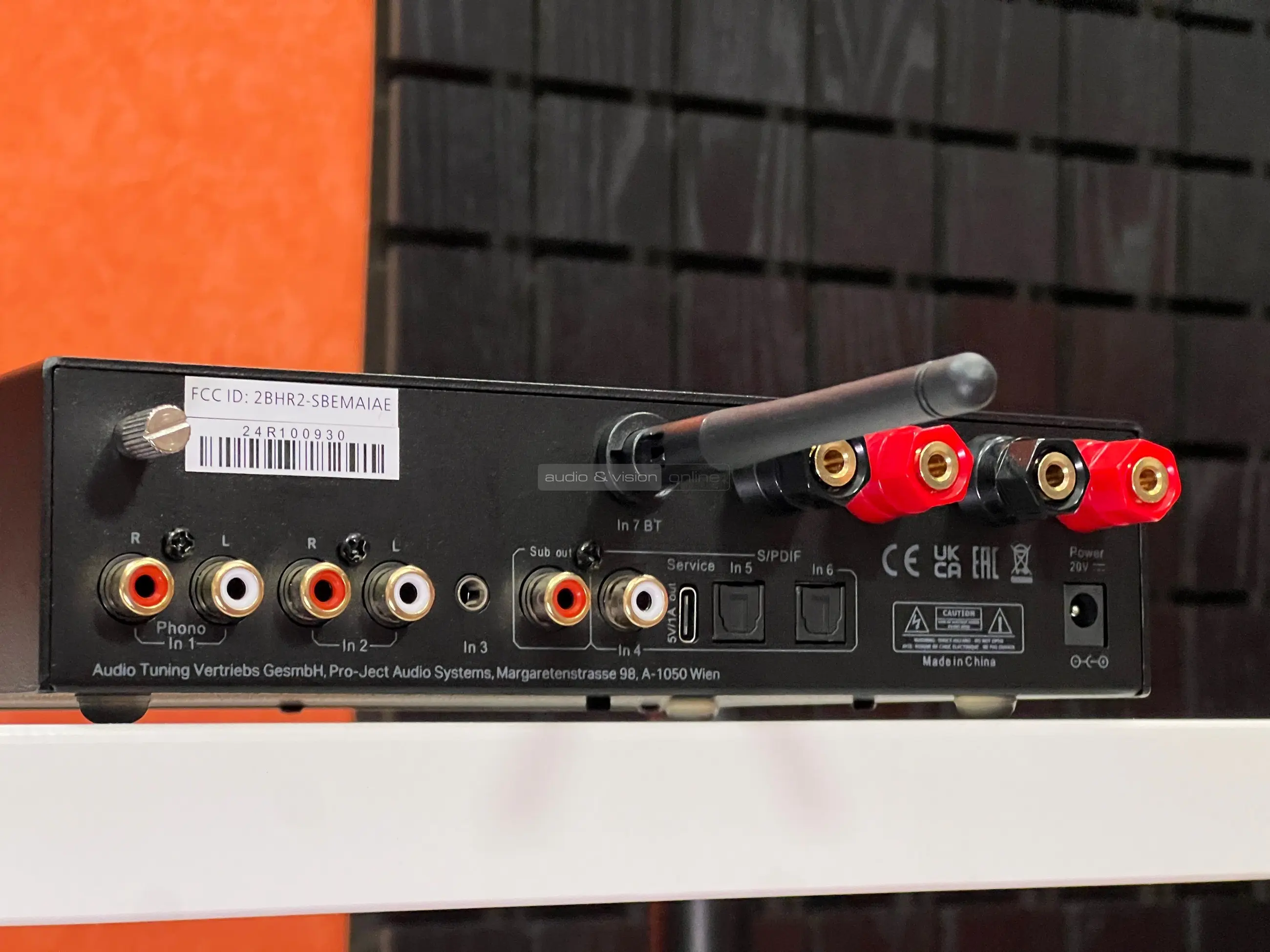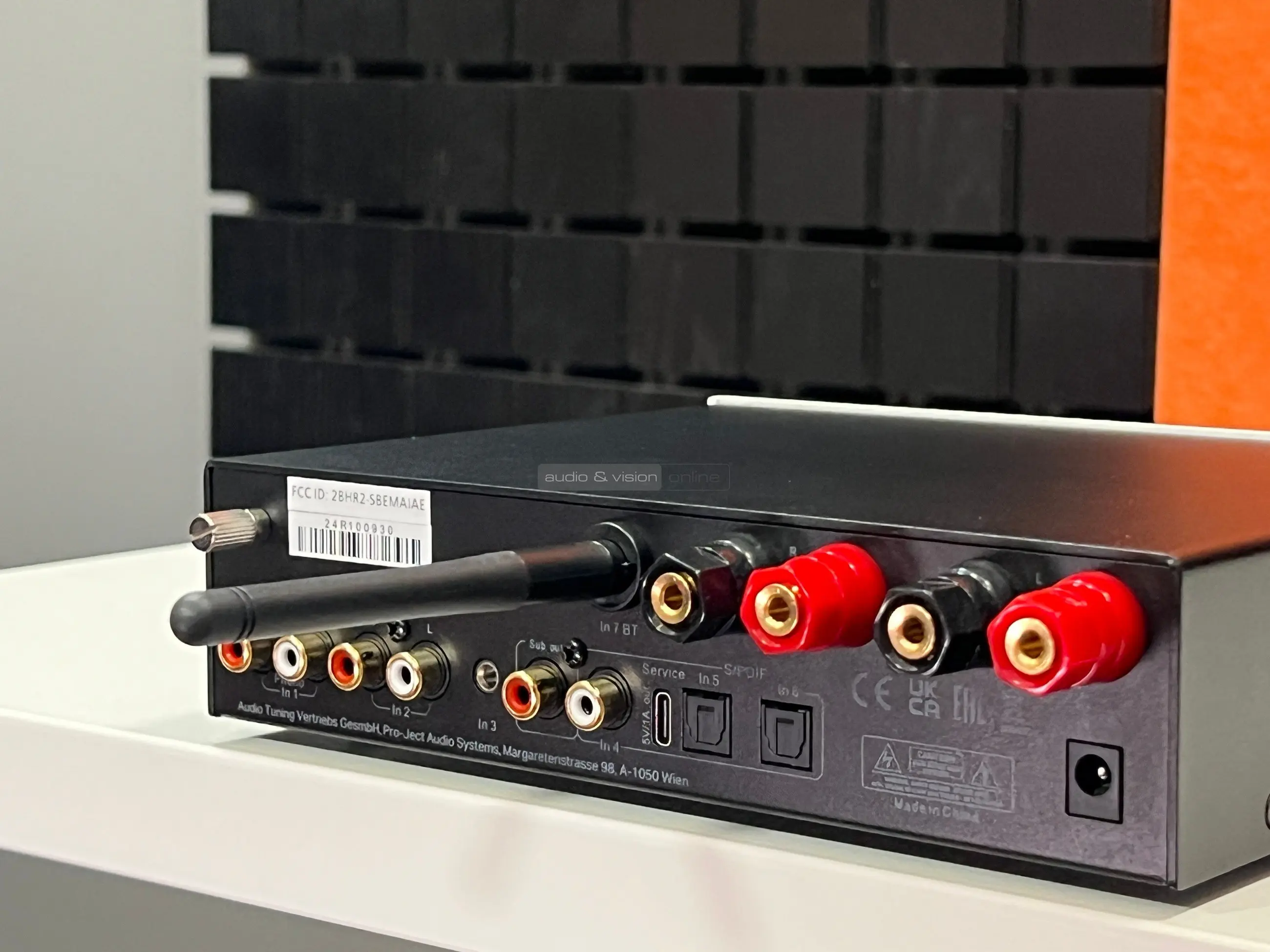 Hátul egy pár vonalszintű RCA és 3,5 mm-es Jack bemenet van, továbbá egy földeléssel ellátott phono is, digitálisból pedig két optikai és egy koaxiális. Kapunk még mélynyomó kimenetet is, USB-C-t a streamerek táplálásához, valamint antennát a Bluetooth jelek fogadására. Hangfalkimenetből egy pár van, az aranyozás nem maradt le, ahogyan a műanyag bevonat sem. Az áramellátásért különálló tápegység felel, ami megtalálható a dobozban, a minden funkció és opció vezérlésére alkalmas kisméretű távvezérlővel együtt.