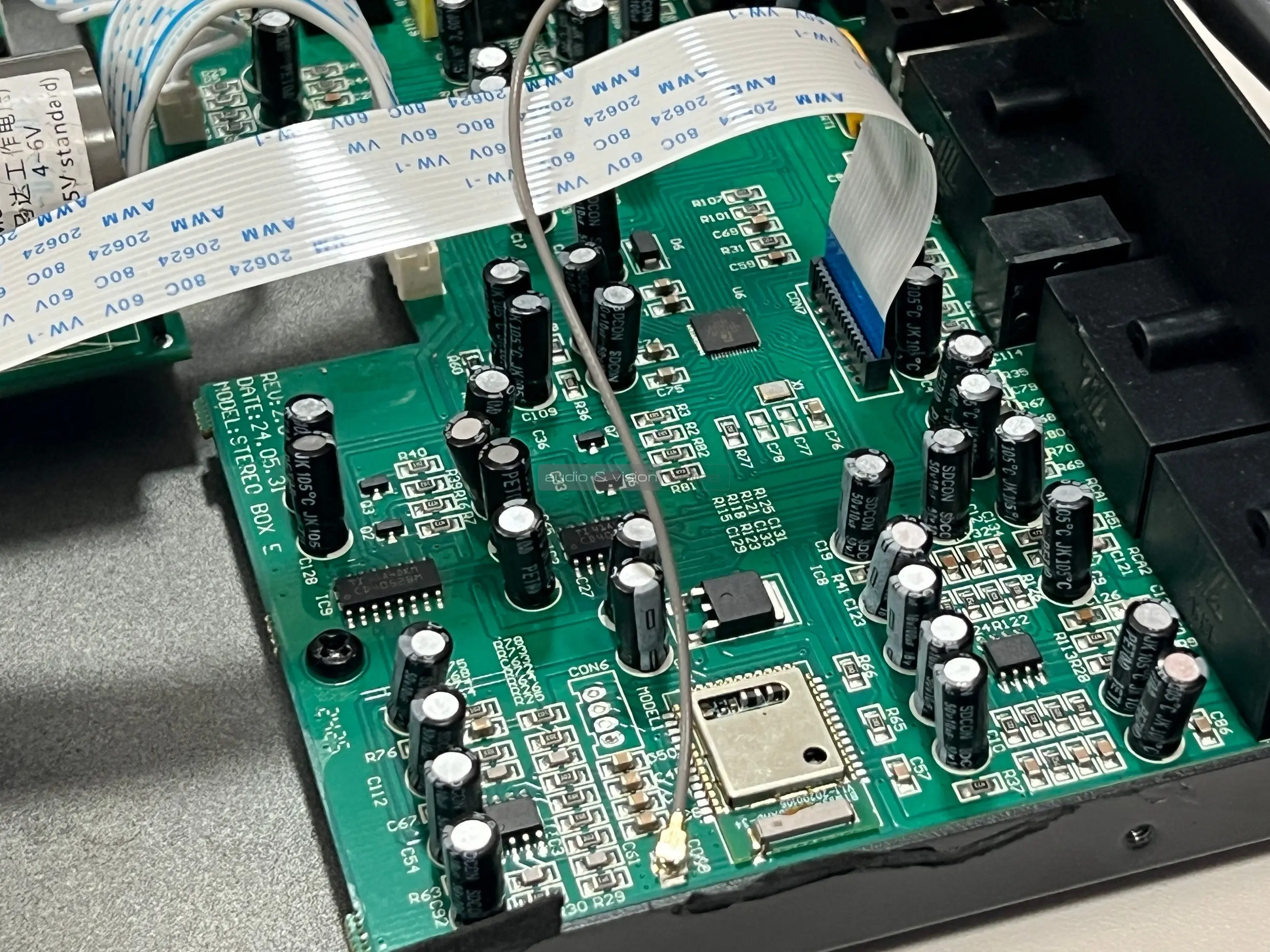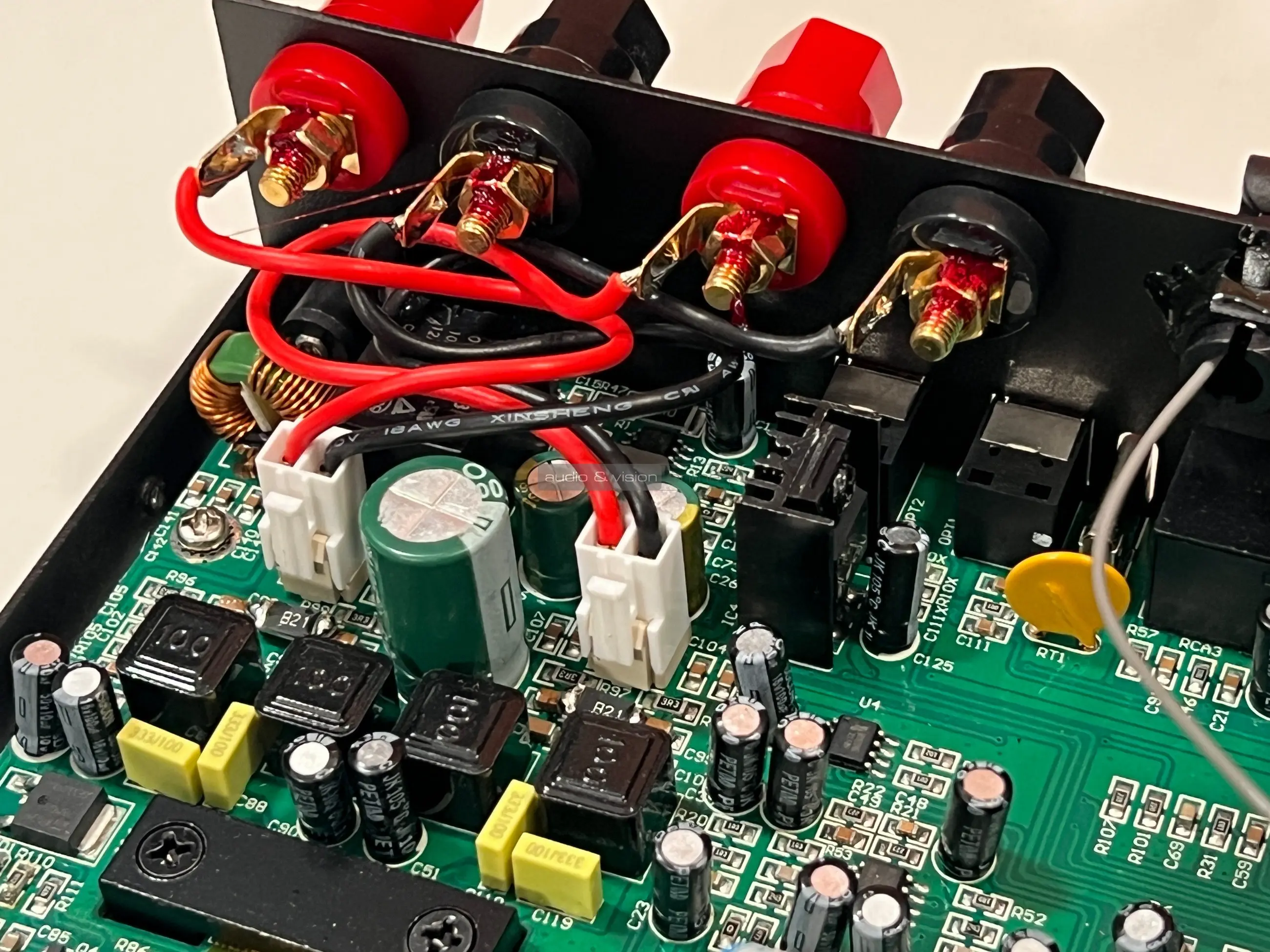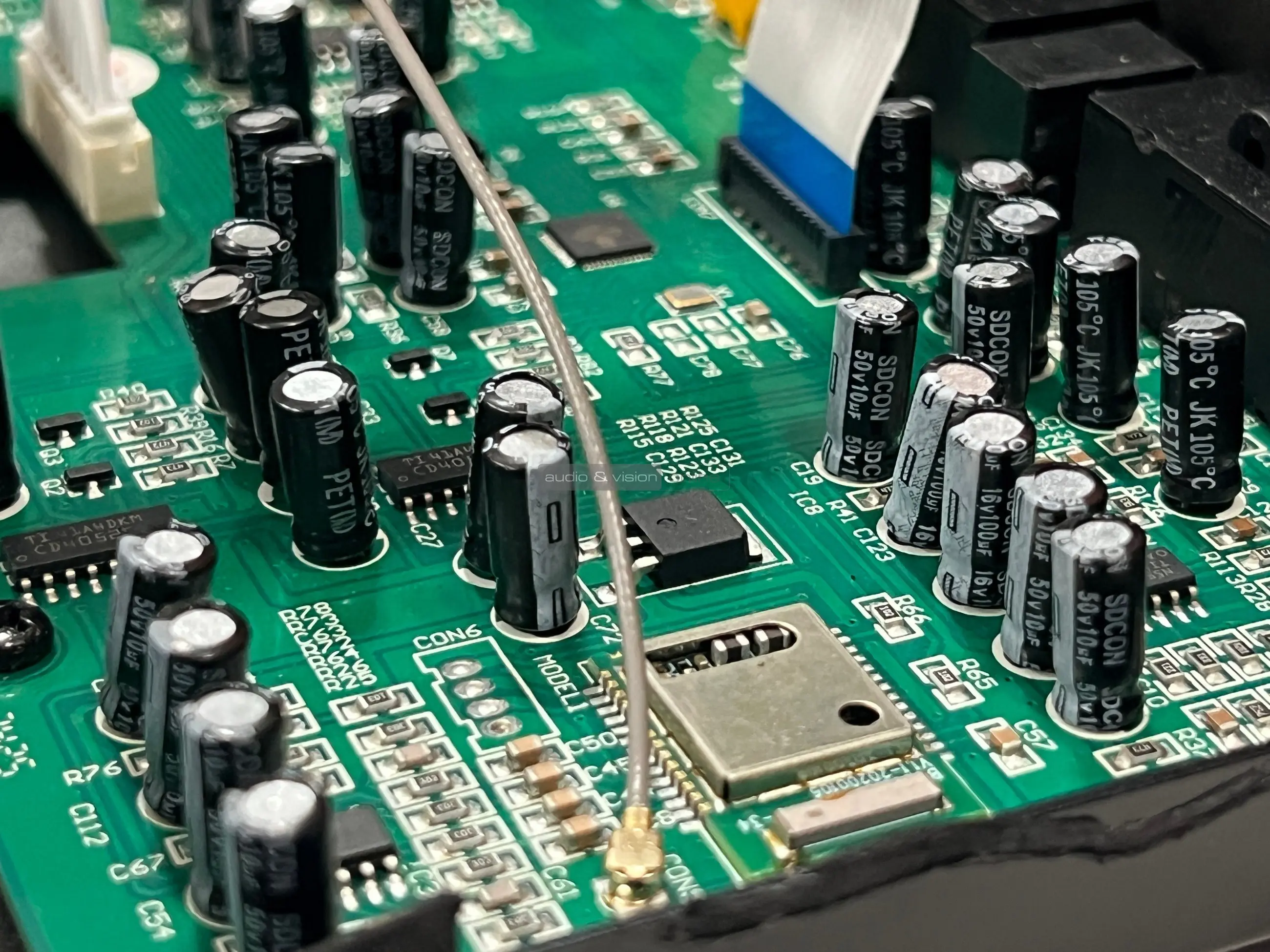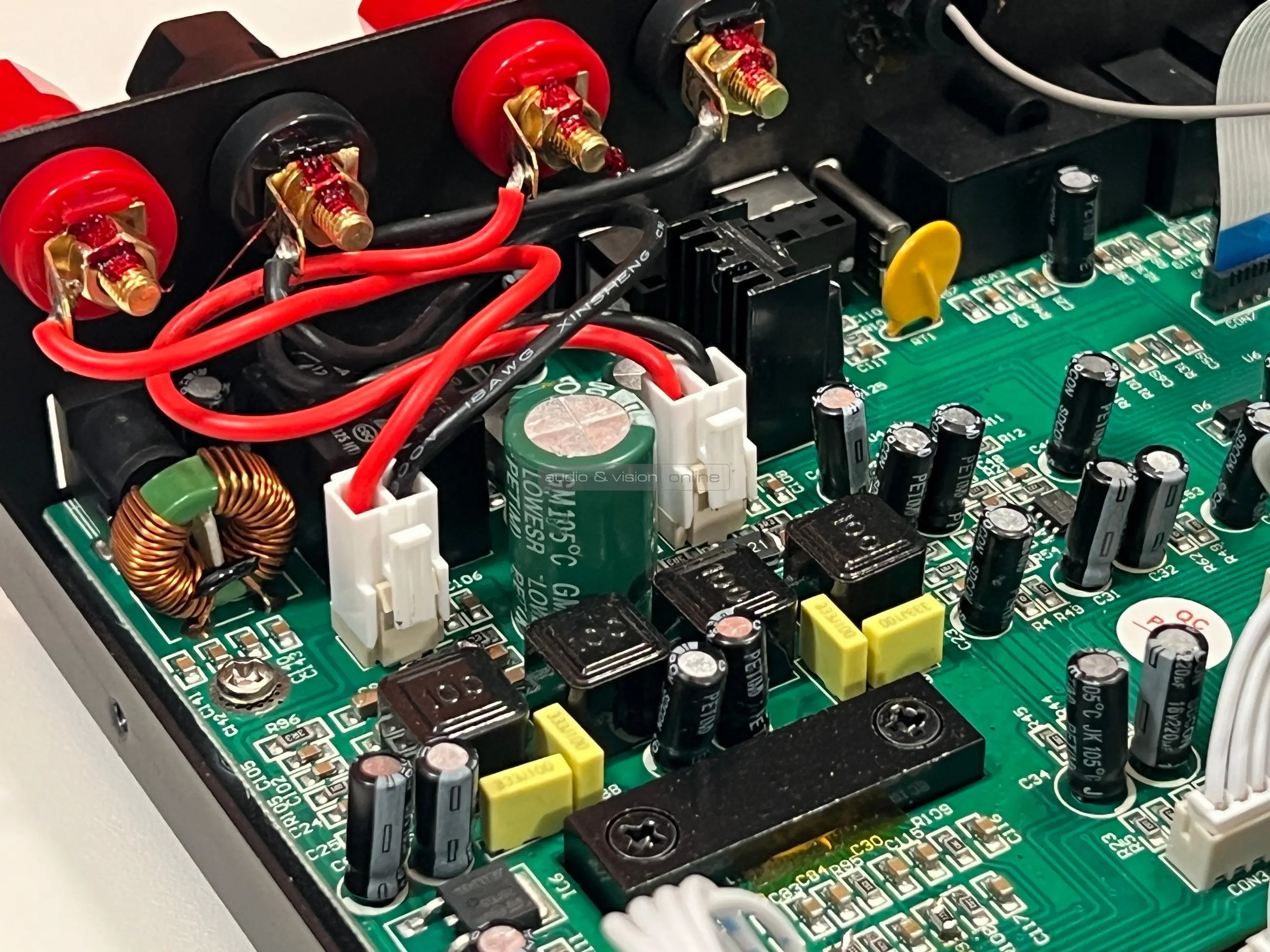 Hátul egy pár vonalszintű RCA és 3,5 mm-es Jack bemenet van, továbbá egy földeléssel ellátott phono is, digitálisból pedig két optikai és egy koaxiális. Kapunk még mélynyomó kimenetet is, USB-C-t a streamerek táplálásához, valamint antennát a Bluetooth jelek fogadására. Hangfalkimenetből egy pár van, az aranyozás nem maradt le, ahogyan a műanyag bevonat sem. Az áramellátásért különálló tápegység felel, ami megtalálható a dobozban, a minden funkció és opció vezérlésére alkalmas kisméretű távvezérlővel együtt.