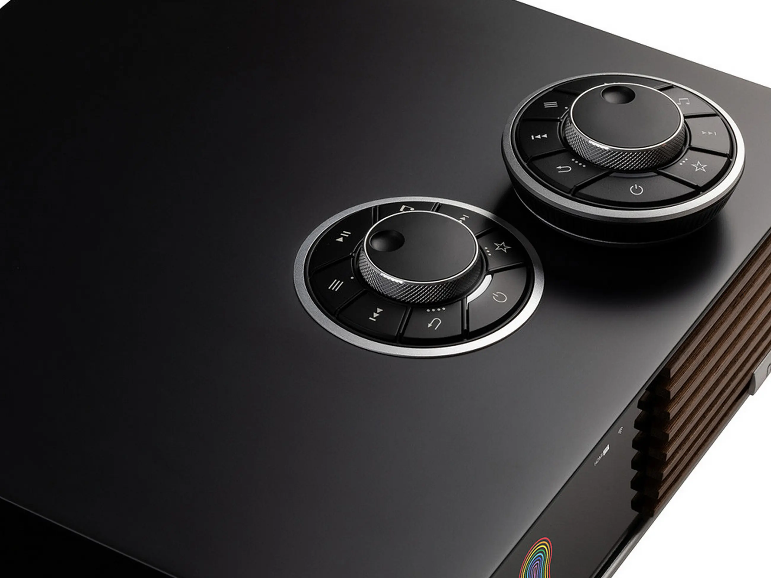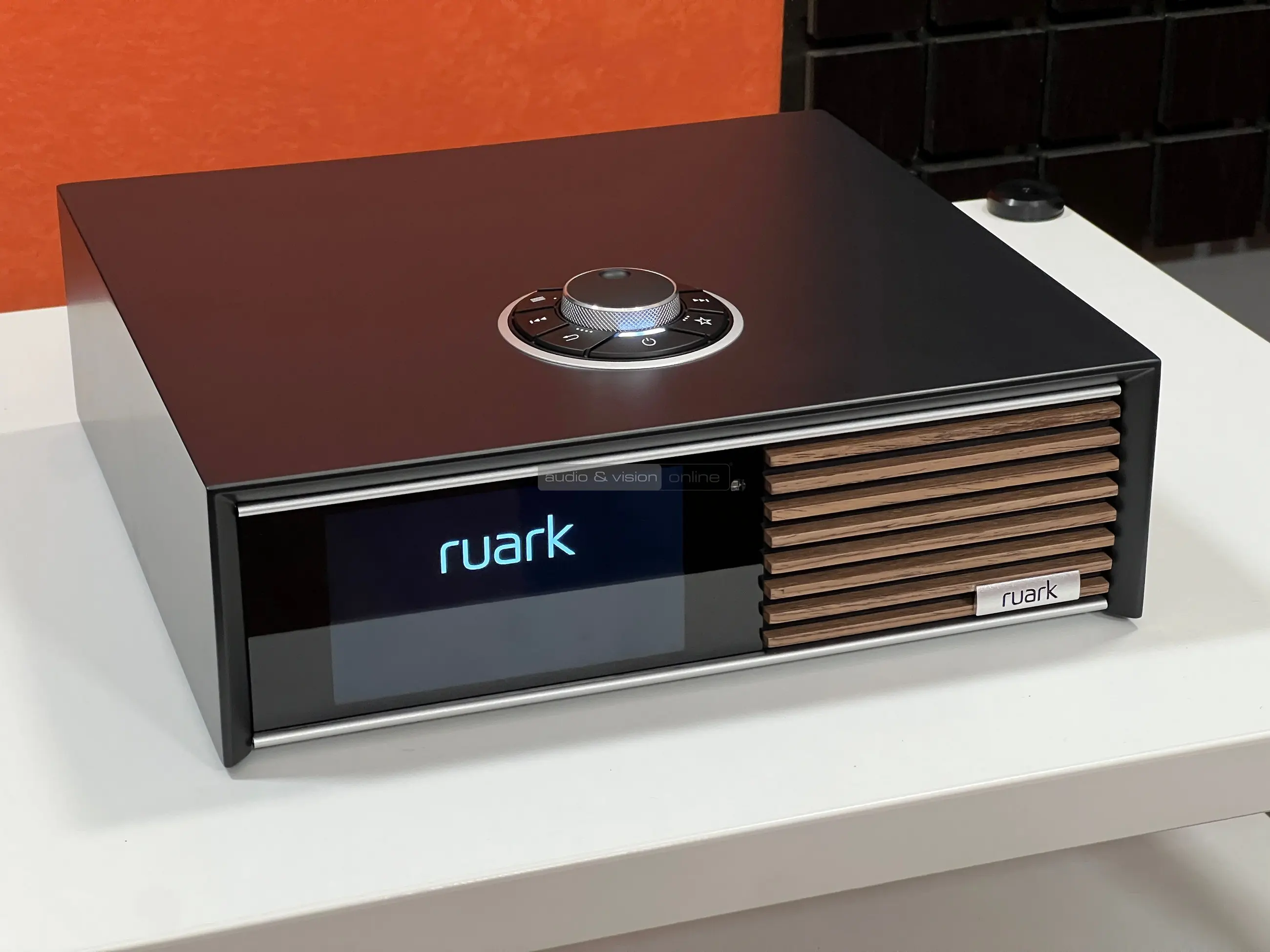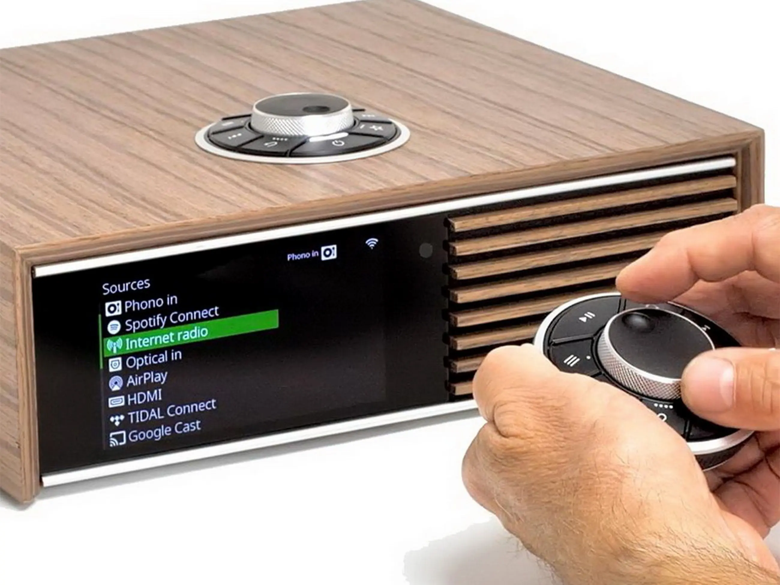 A Ruark R610 szürke és dió változatban kapható, a hangfalhoz hasonlóan itt is megtalálható a lécszegély a frontoldalon, mellette pedig egy 5 colos TFT kijelző, mely távolról is elég jól olvasható. A fadíszítésű, egyébként alumíniumból készült készülék tetején van a közel 20 éve kifejlesztett RotoDial vezérlőközpont, de plusz érdekesség, hogy mellékel a gyártó egy ugyanilyen kezelőszervet távirányítóként is a modellhez. Hátul vonalszintű ki- és bemeneteket találunk, köztük phonot is, de van optikai és eARC képes HDMI bemenet, mélysugárzó kimenet, Ethernet és USB-C aljzat is.