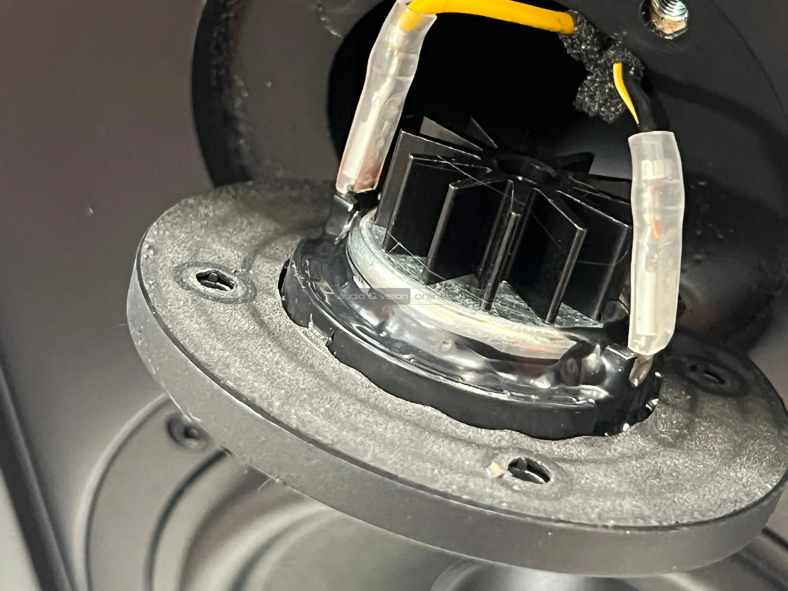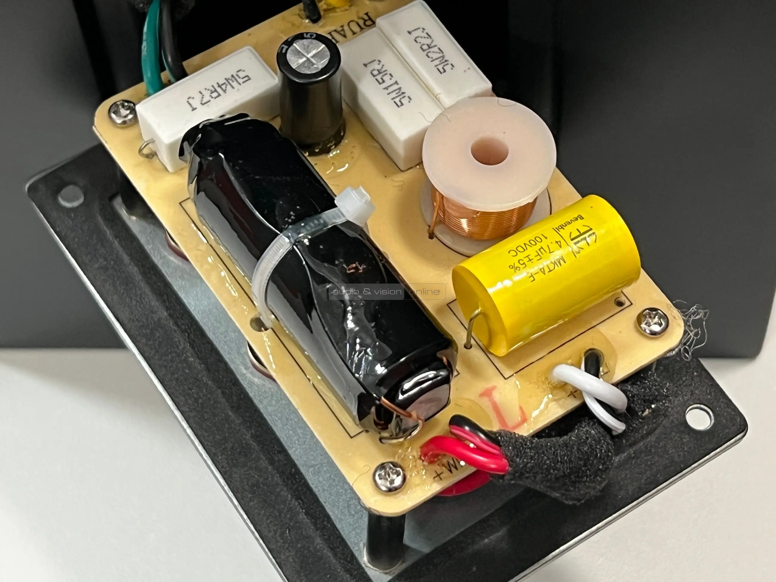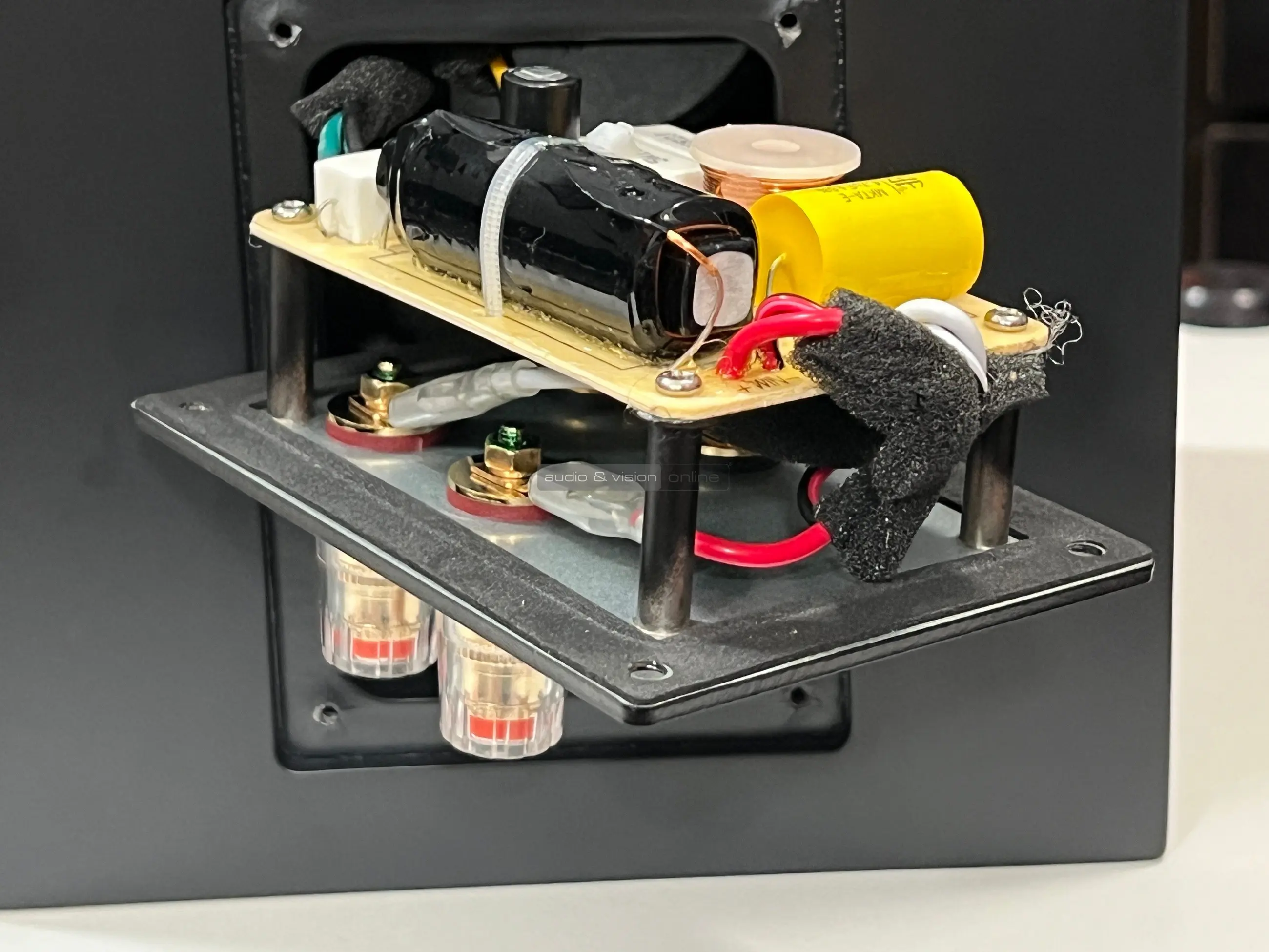 A hátoldalon a basszreflex nyílás alatt dupla, nagyon vaskos, aranyozott bemenetek találhatók, amelyek teflon védelmet kaptak, és a banándugót is fogadják.