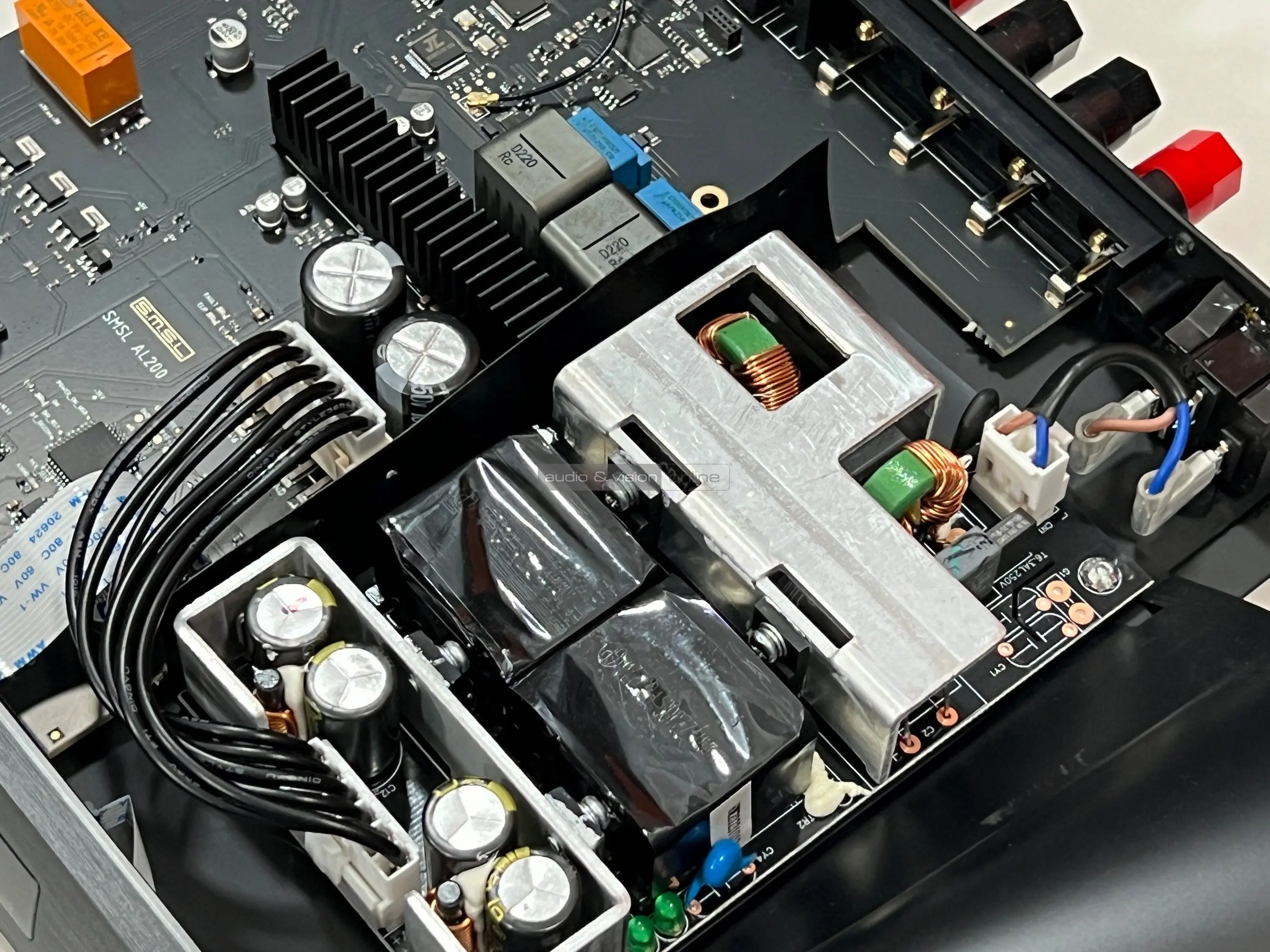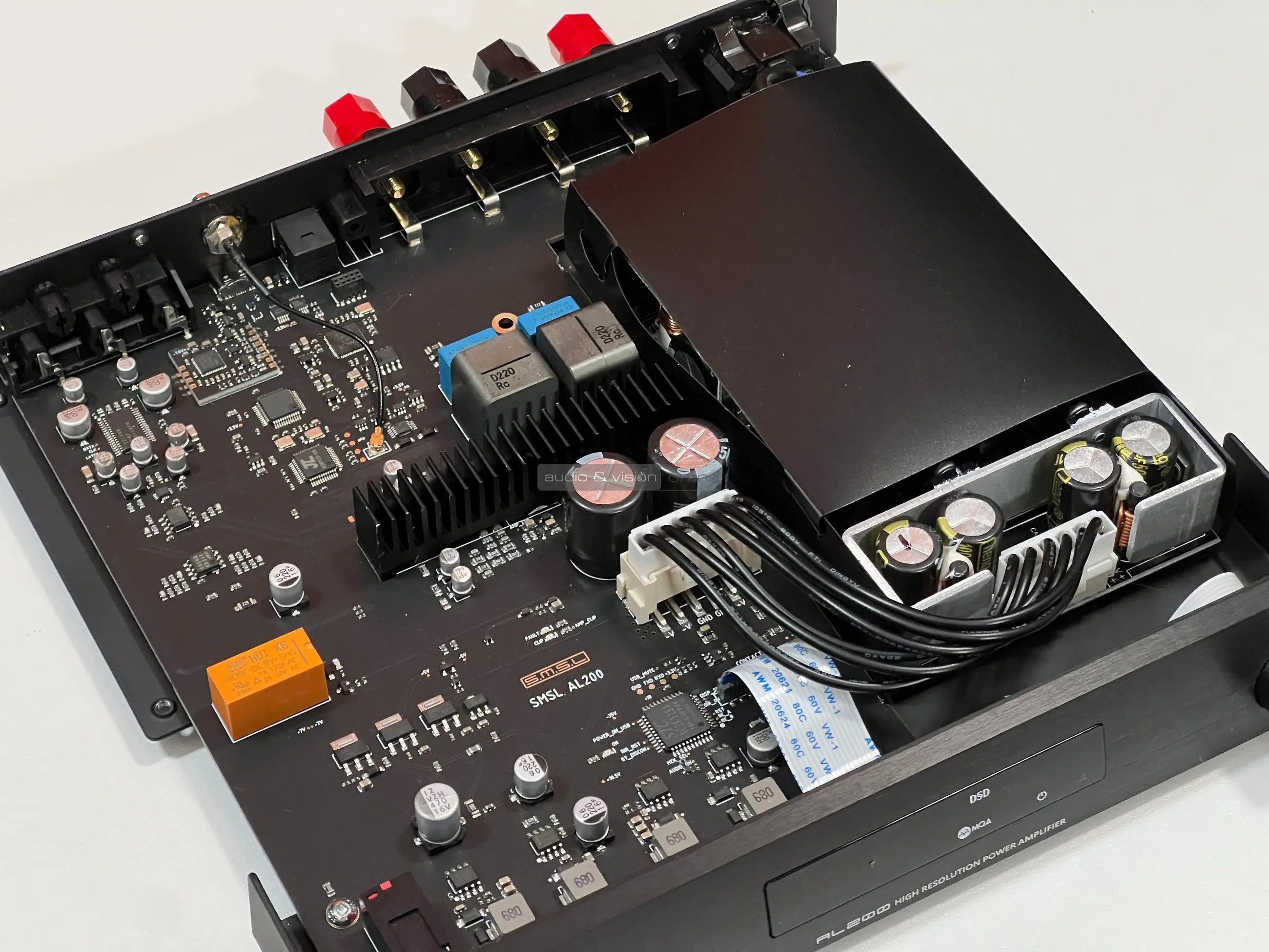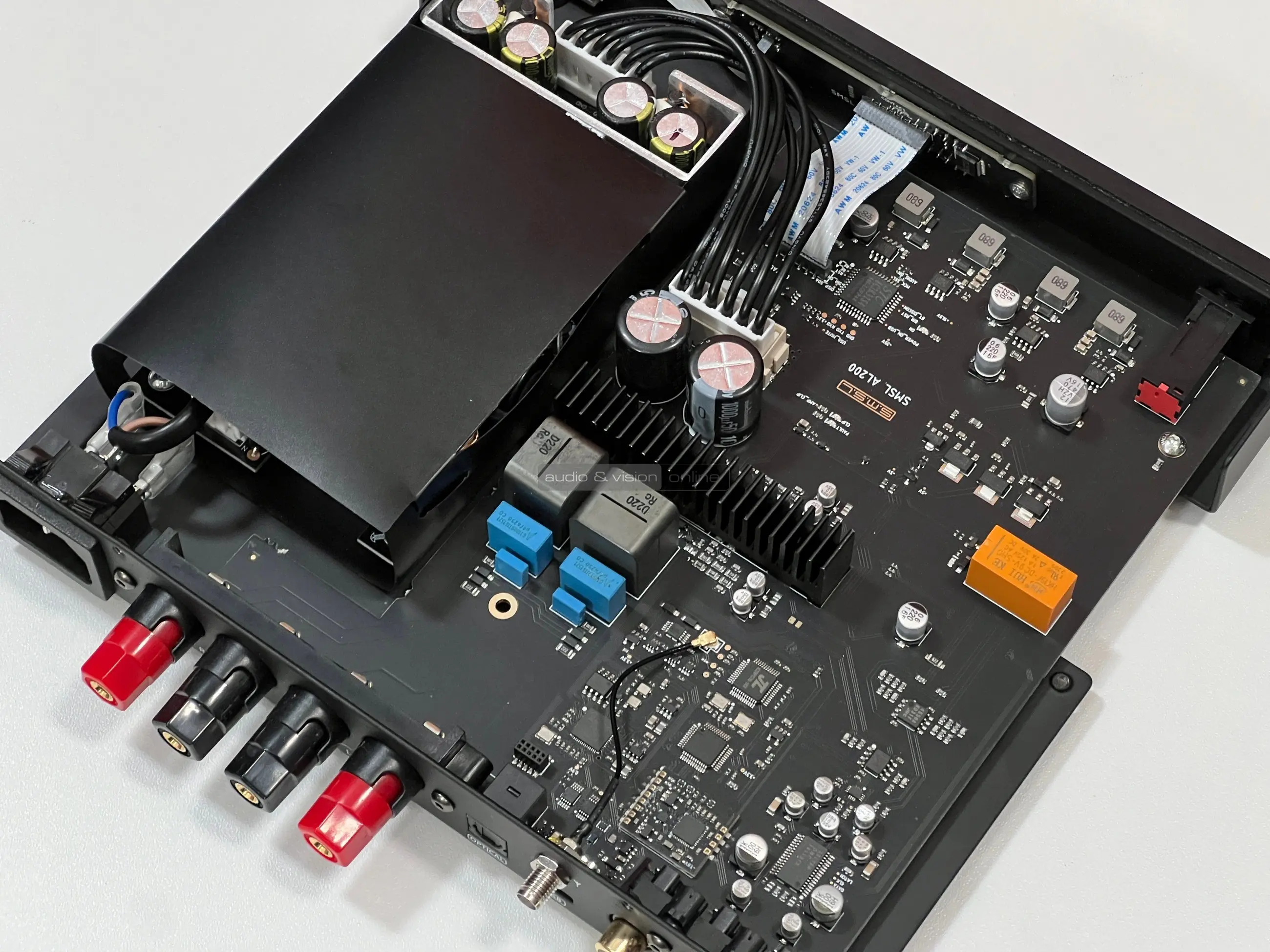 A belsejében is érdemes elkalandoznunk, hiszen mindent megtalálunk, ami csak elfért, ráadásul nem is alapszinten. Az SMSL AL200 D osztályú integrált erősítő, aminek teljesítménye 2x165 W 4 ohmon és 2x85 W 8 ohmon. Ez bőven elég lehet bármilyen hétköznapi, tehát nem extrém felépítésű és alacsony érzékenységű hangfal meghajtásához. A konstrukció maga a német Infineon MERUS MA5332MS erősítő modulra épült, ahol maga a chip nagy hatékonyságú és alacsony energiafogyasztású, valamint a minőségre is odafigyeltek, így került bele túlmelegedés és túláram védelmi áramkör és nagy teljesítményű speciális kapcsolóüzemű tápegység.