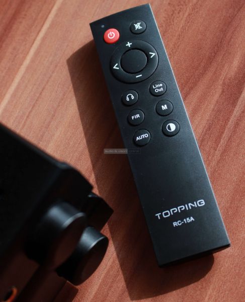 Az előlap jobb oldalán mindössze egyetlen kezelőszerv helyezkedik el, a méretes, többcélú forgatógomb, amivel a hangerőt, a bemenetváltást és az egyéb más funkciókat lehet kezelni. Igaz ezt jóval kényelmesebben is megtehetjük a mellékelt távirányítóval - igen, van hozzá - a bal oldalon ékeskedik a finom narancssárgán világító kijelző, amin a legfontosabb funkciók jelennek meg; a bemenet típusa, a mintavételi frekvencia, az erősítés típusa (sima DAC, vagy előerősítő beállítás) és a hangerő, ha előerősítő üzemmódban van a készülék.