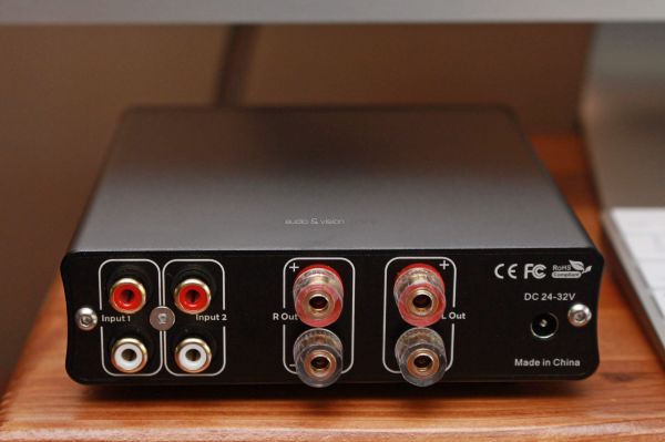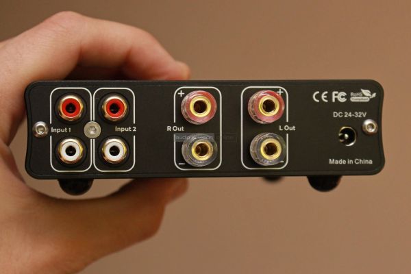 Hátul már valamivel izgalmasabb a helyzet, két pár RCA bemenet, tehát két darab kütyüt lehet rákötni a Topping PA3-ra, egy pár banán aljzattal ellátott hangfal kimenet és egy DC tápcsatlakozó bemenet van a külső tápegység számára (24-32 V). Szimmetrikus csatlakozó nincs, igaz nincs rá feltétlenül szükség és el sem férne, maximum a PA3 oldalán.