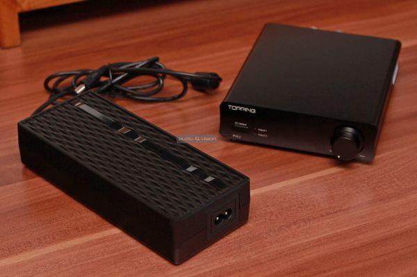 A külső tápegység már egy méretesebb darab, konkrétan nagyobb, mint a PA3, téglalap alakú, szintén egy nem vakító kék LED-del ellátva, "borotva" kivitelű táp csatlakozóval és DC kimenettel, ahol 32 V/5,5 A a kimenő áram és feszültség, ami egész tekintélyes 176 W teljesítményt tud leadni a D osztályú erősítőnek, így a 2x80 W is hihetőnek tűnik.