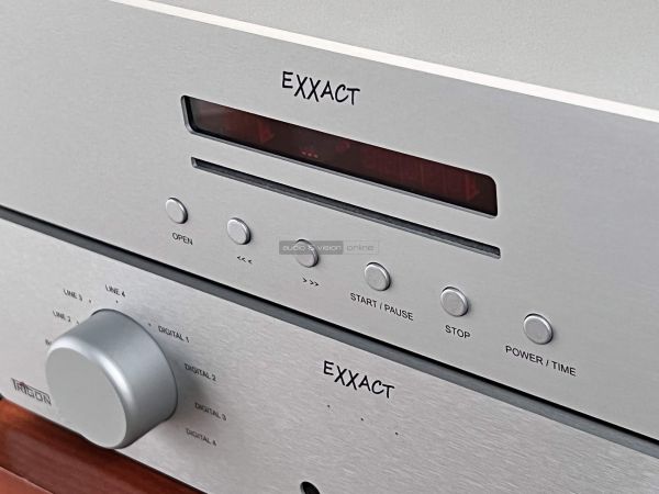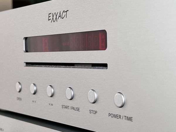 Az EXXACT CD-PLAYER le sem tagadhatná a rokoni szálakat. A mechanika középre került, ami kívülről csak egy rés, tehát a mozgó fiókot, és az általa felmerülő hibalehetőségeket kiküszöbölték. Felette található a kijelző sáv, amiben piros LED mutatja az aktuális információkat. Hátul 1-1 pár RCA és XLR aljzat fogad minket, digitális téren pedig optikai és koaxiális. Az említett kijelző fényereje csökkenthető, az ehhez tartozó gombot szintén hátra helyezték el, ahogyan az üzembehelyező billenőkapcsolót, és a tápkábel itt is kedvünkre cserélhető.