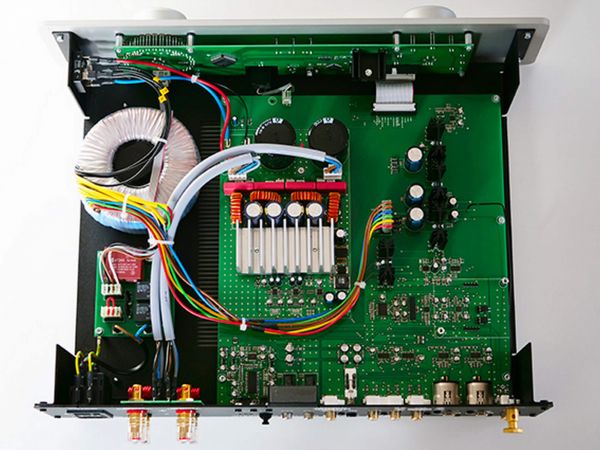 Mindenképpen érdemes kiemelnünk a négy szekcióra osztott, SMD technológiájú nyomtatott áramköri lapot, vagy a Burr-Brown és Cirrus Logic integrált áramköröket. Külön alkalmazták a Burr-Brown OPA4134UA operációs erősítőt az analóg XLR aljzatokhoz, és külön HEF4051BT áramkörök vannak az analóg RCA kimenetekhez, még a hangerőszabályzó áramkörében is egy Burr-Brown PGA2111U chip lakozik. A D osztályú végfokok hőtermelése elenyésző, a biztonság kedvéért azért kisebb hűtőbordákat kaptak, és mindkét csatorna számára külön LC kimeneti szűrőt és Wima MKS4 fólia kondenzátorokat szereltek a készülékbe.