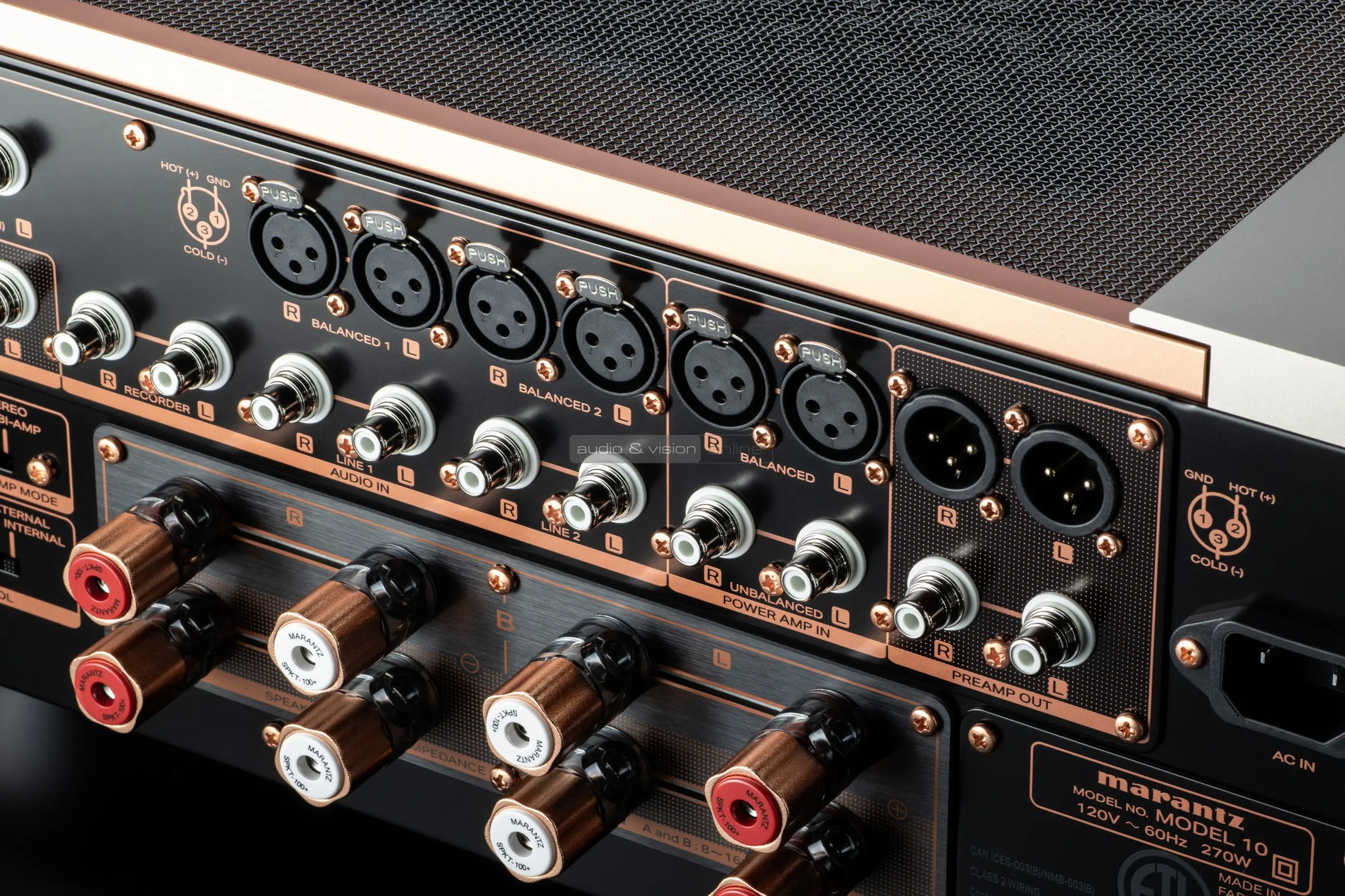 A fentebb említett trió elsőként bemutatott tagja a MODEL 10, mely a valaha létező legnagyobb teljesítményű Marantz integrált sztereó erősítő. Teljesen új, rézbevonatos, háromrétegű készülékházzal rendelkezik, kamrás belső rendszerrel, amely minden kritikus funkciójú részt elkülönítve tartalmaz.