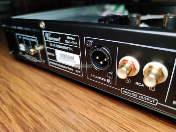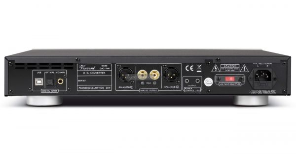 Hátul három bemenet: koaxiális, optikai, USB, egy pár RCA, dicséretes módon egy pár XLR kimenet, egy távvezérlő pár csatlakozó (más Vincent készülékekhez), egy hálózati feszültség szelektor és egy IEC táp dugalj található, azaz nem csak a gyárival, hanem speciális tápkábellel is lehet használni, ami általában erősen ajánlott megoldás.