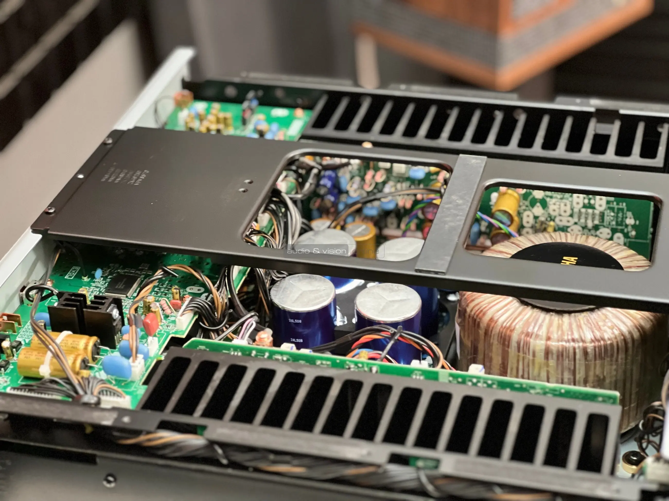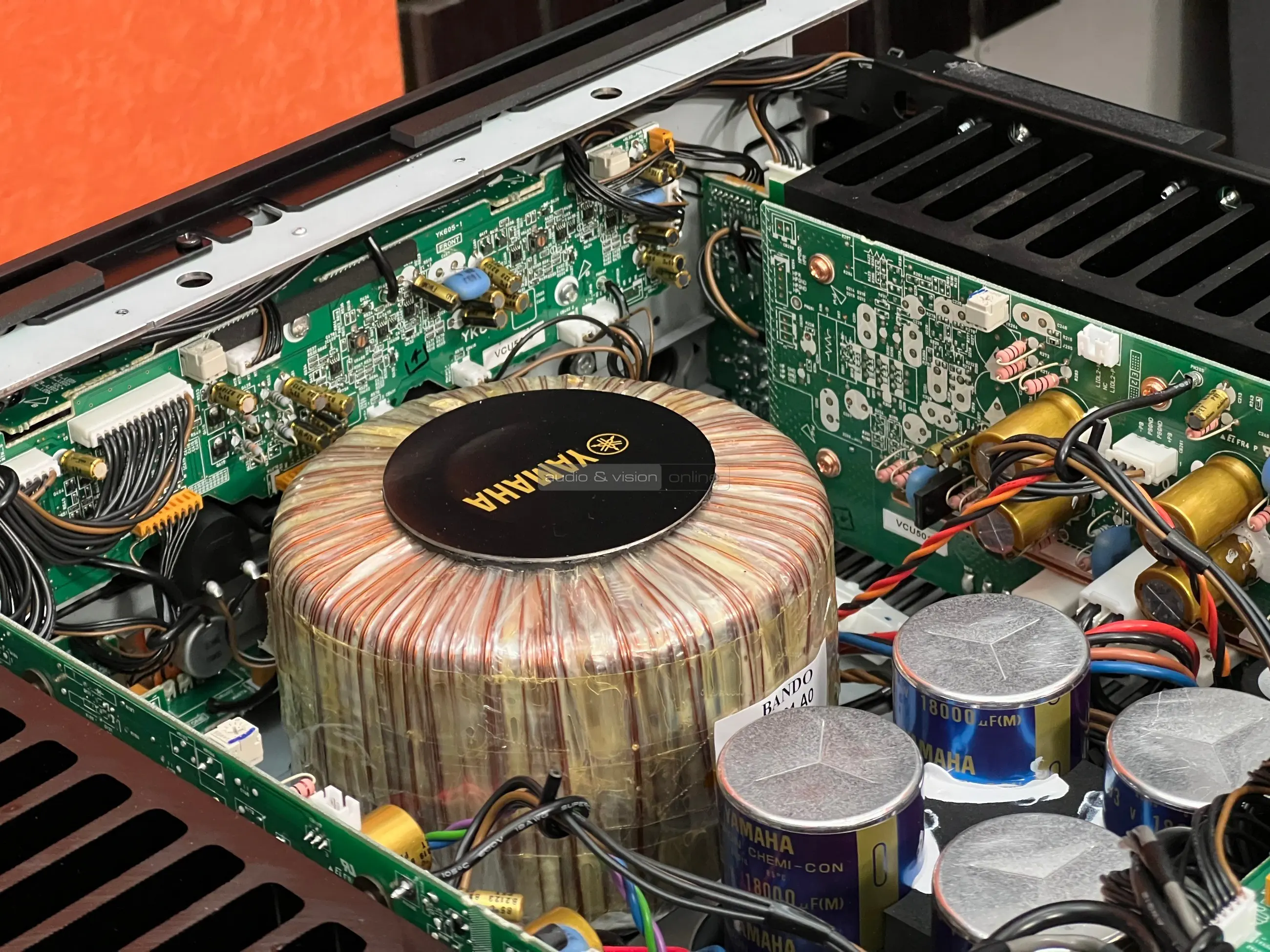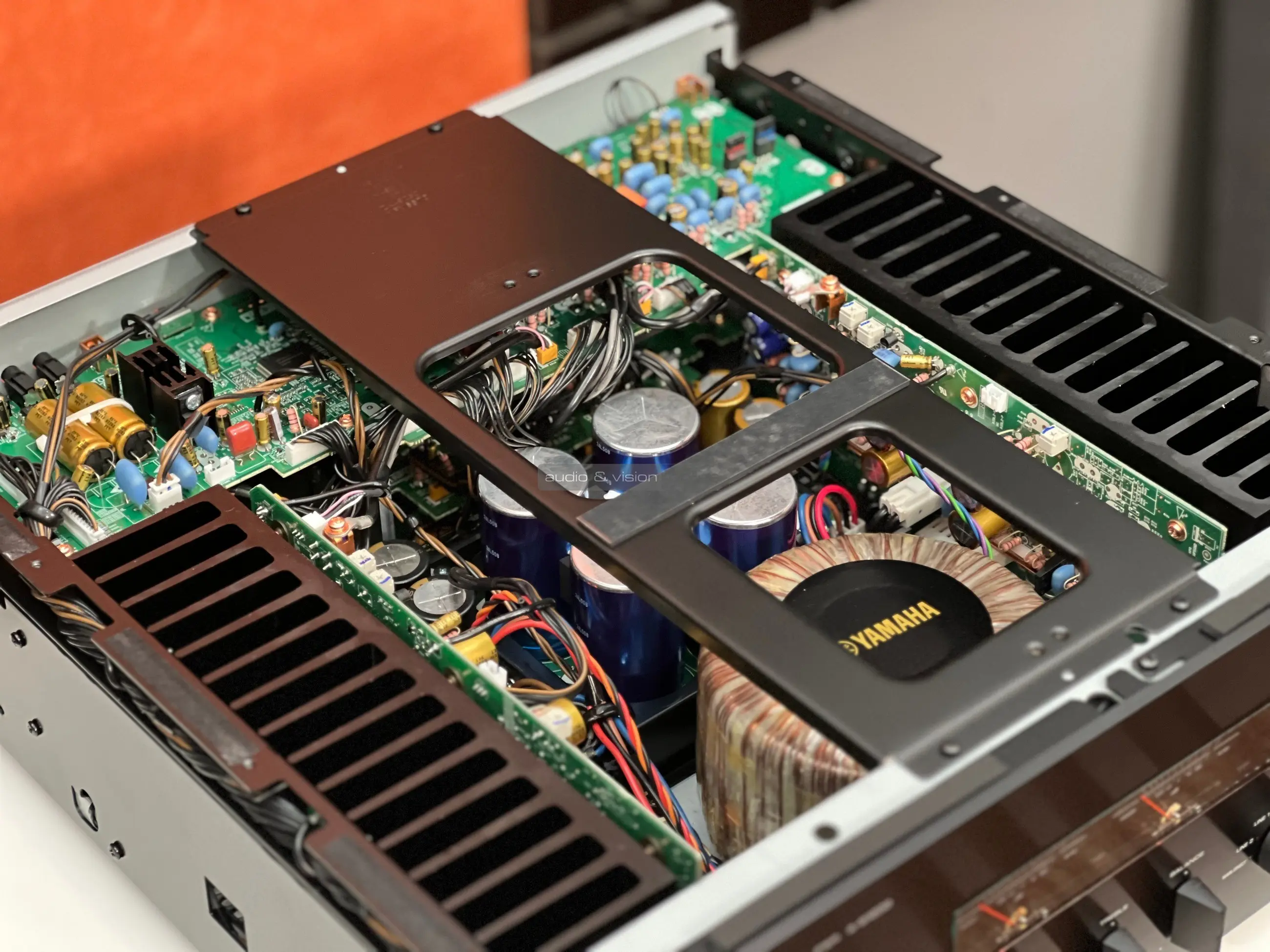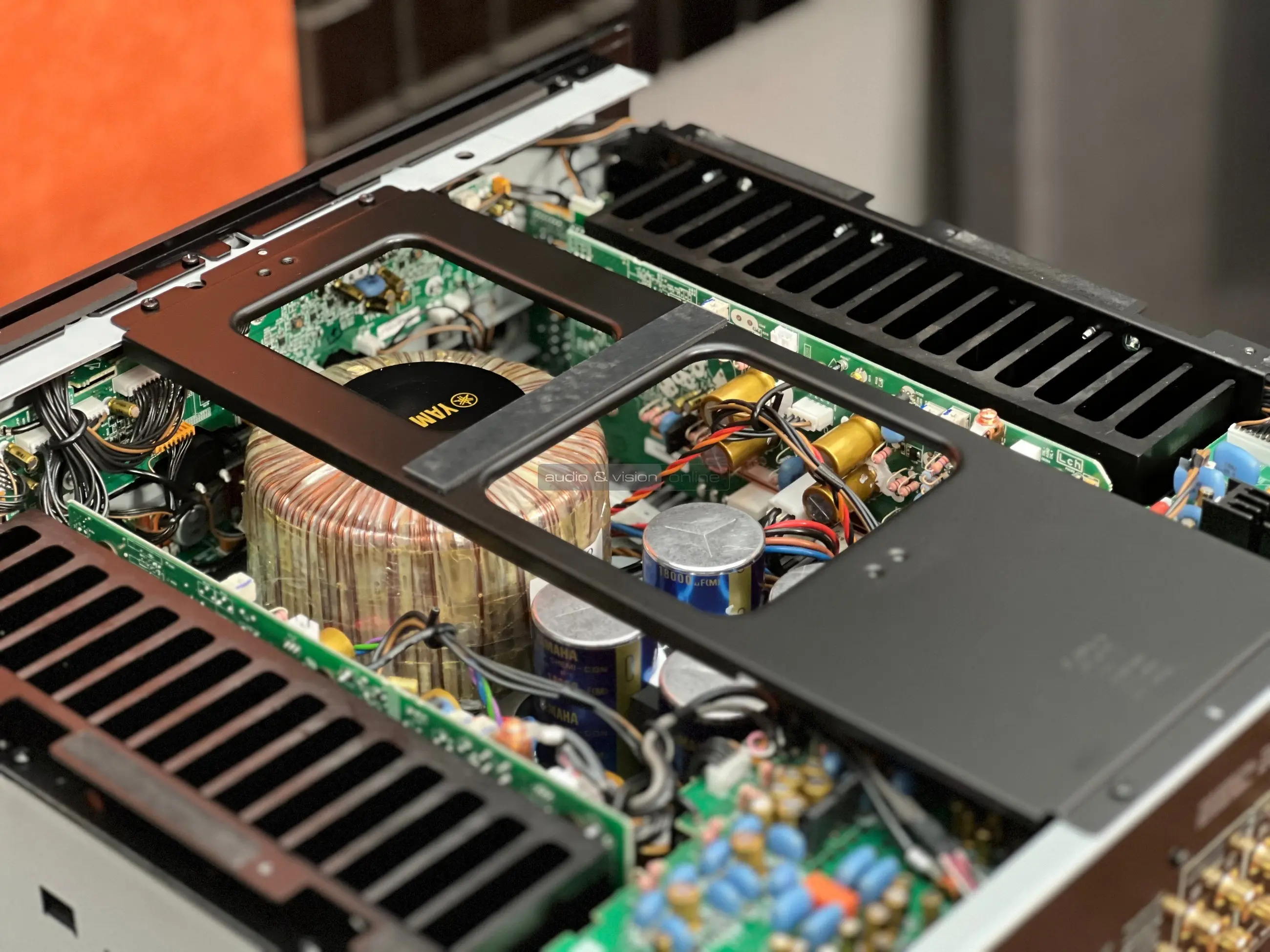 Az A-S1200 teljesítménye csatornánként 150 W 4 ohmon, aminek előállításához 625 VA-es toroid transzformátort alkalmaztak, valamint nem hiányoznak az ezt körülölelő hűtőbordák sem a fabetétek felőli belső oldalakon. A tetőlapot leemelve példás rendet találunk, minden logikusan van elhelyezve, és még némi levegő is jutott közéjük, tehát ebben az esetben valóban indokolt a jelentős kiterjedésű készülékház.