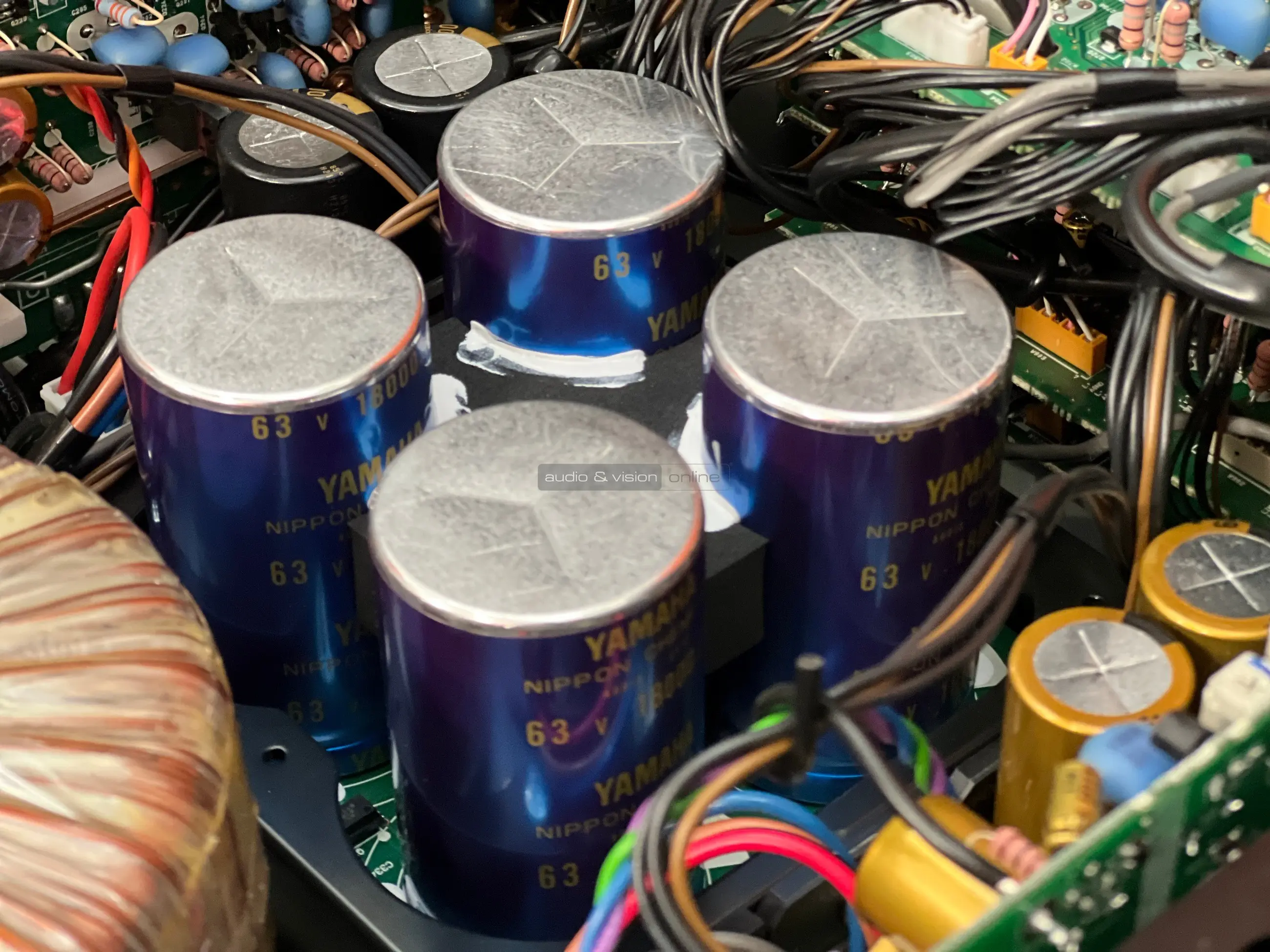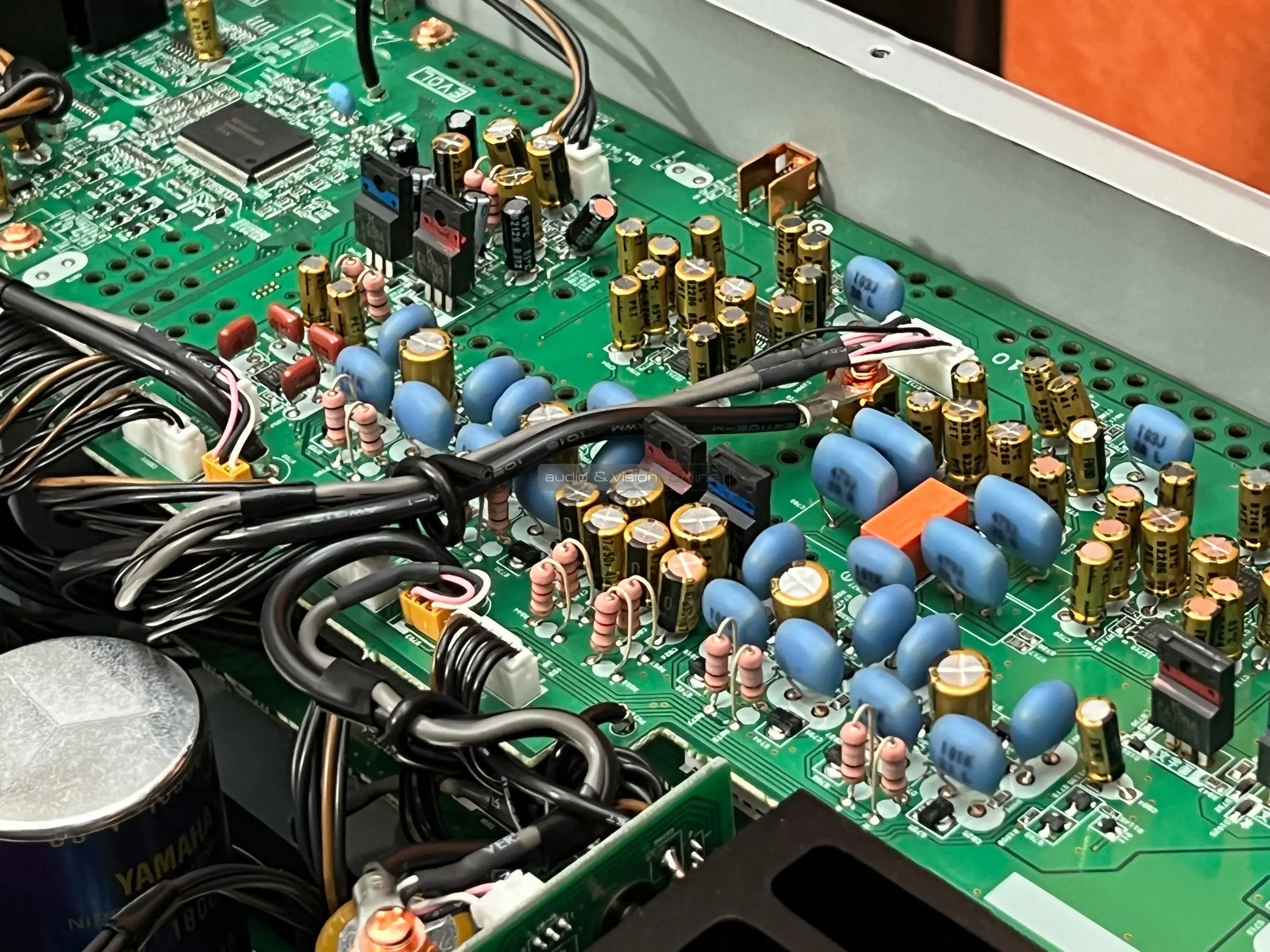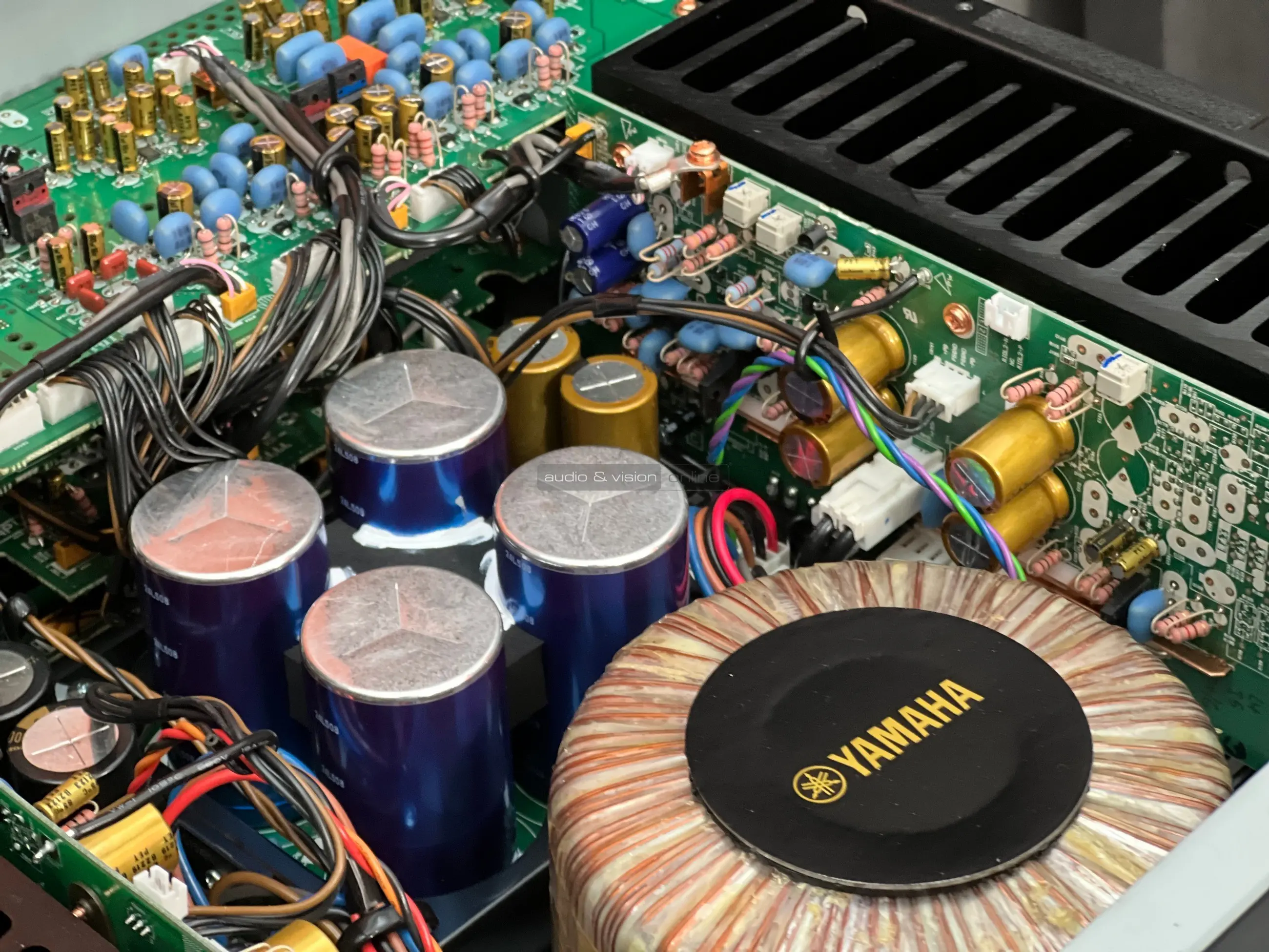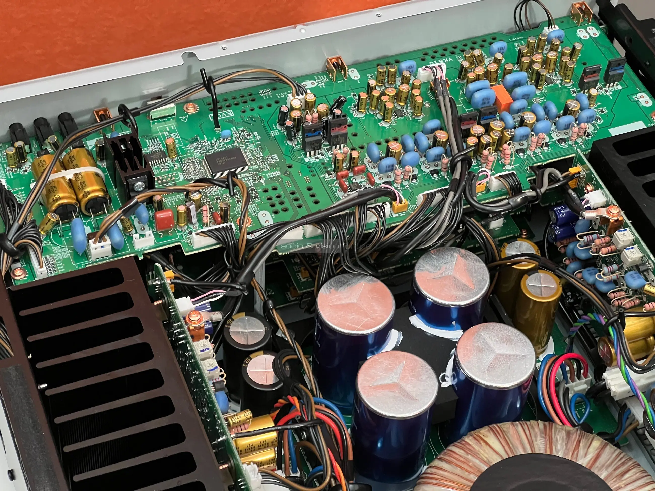 Az A-S1200 teljesítménye csatornánként 150 W 4 ohmon, aminek előállításához 625 VA-es toroid transzformátort alkalmaztak, valamint nem hiányoznak az ezt körülölelő hűtőbordák sem a fabetétek felőli belső oldalakon. A tetőlapot leemelve példás rendet találunk, minden logikusan van elhelyezve, és még némi levegő is jutott közéjük, tehát ebben az esetben valóban indokolt a jelentős kiterjedésű készülékház.
