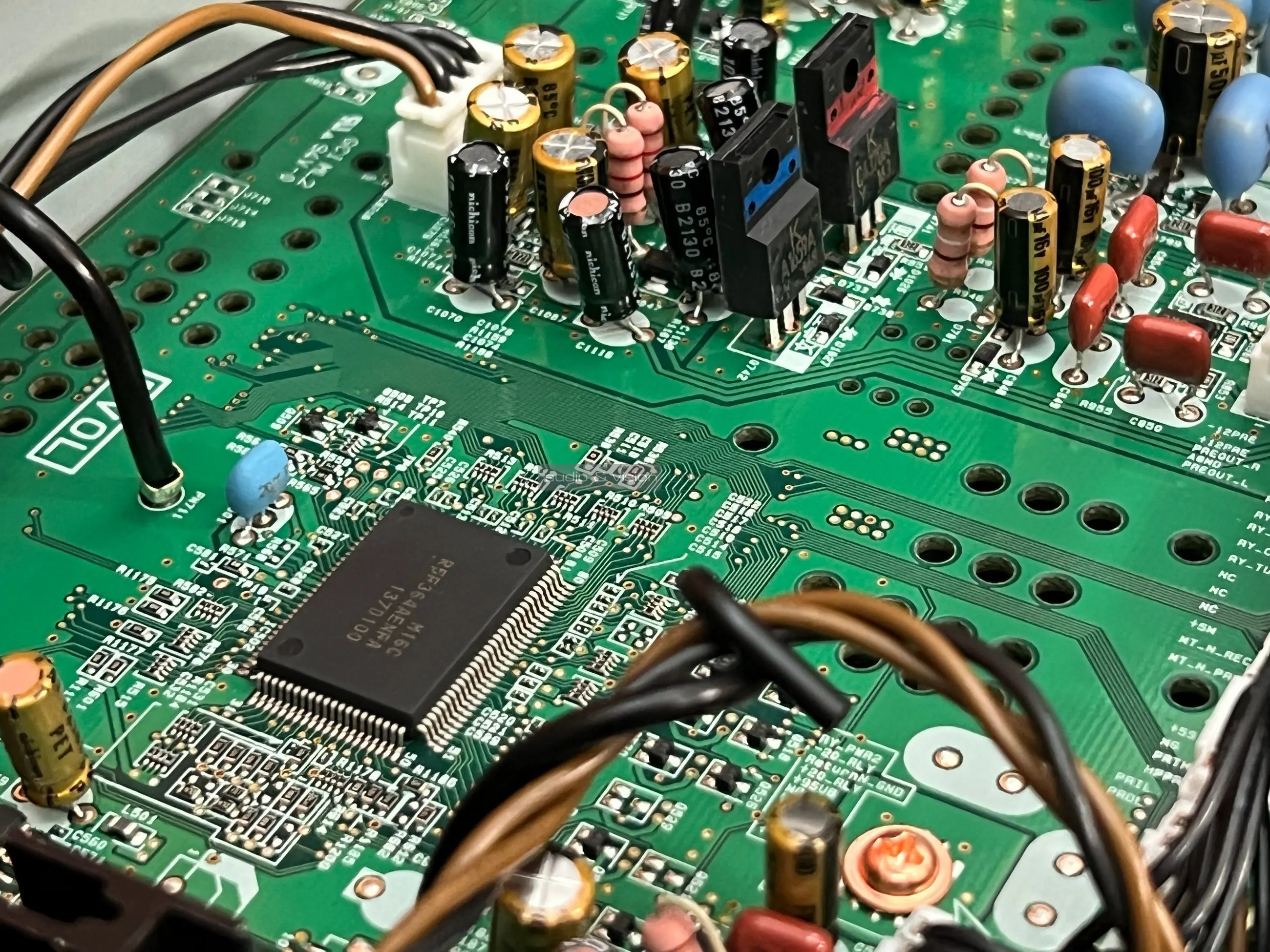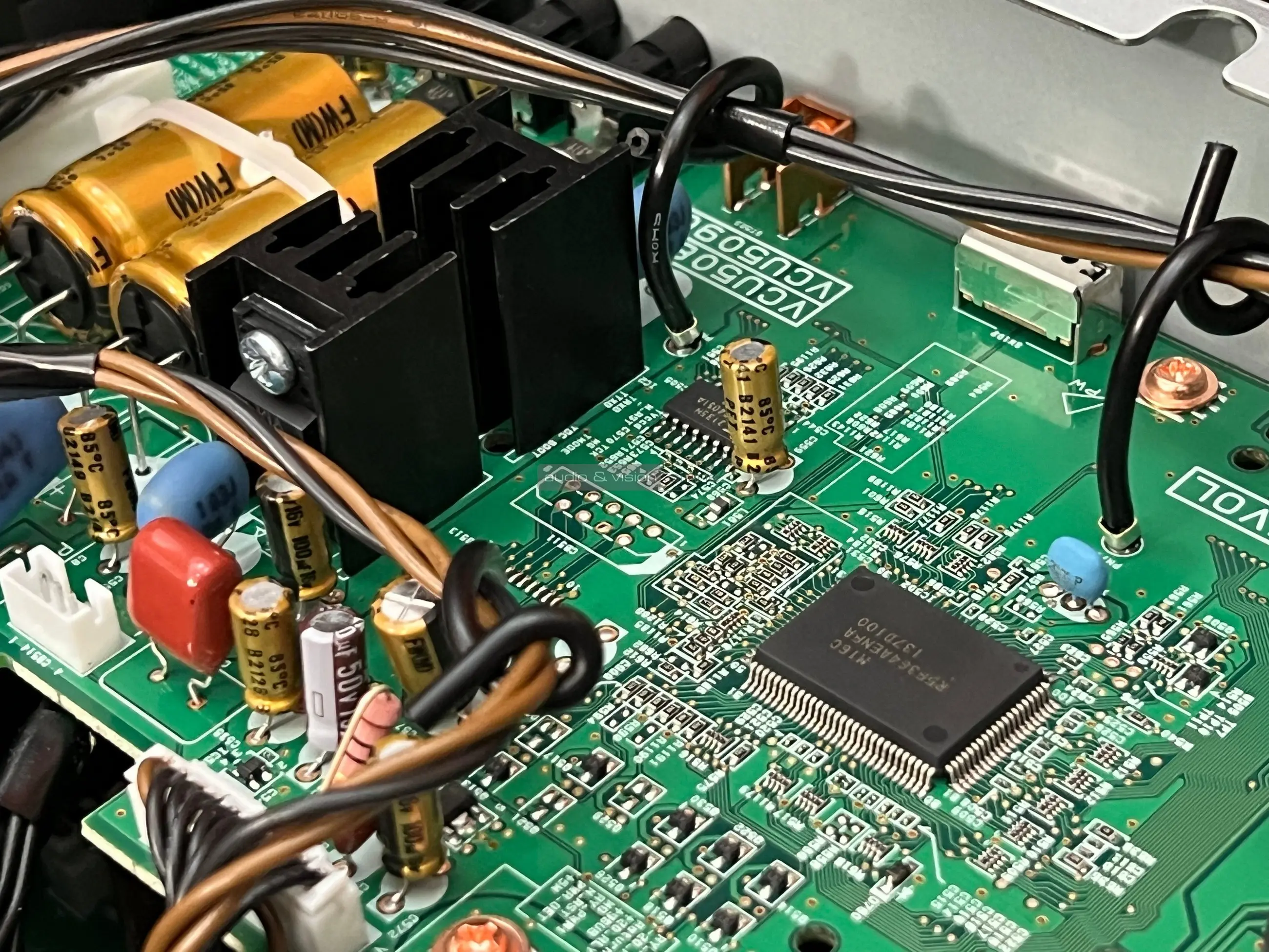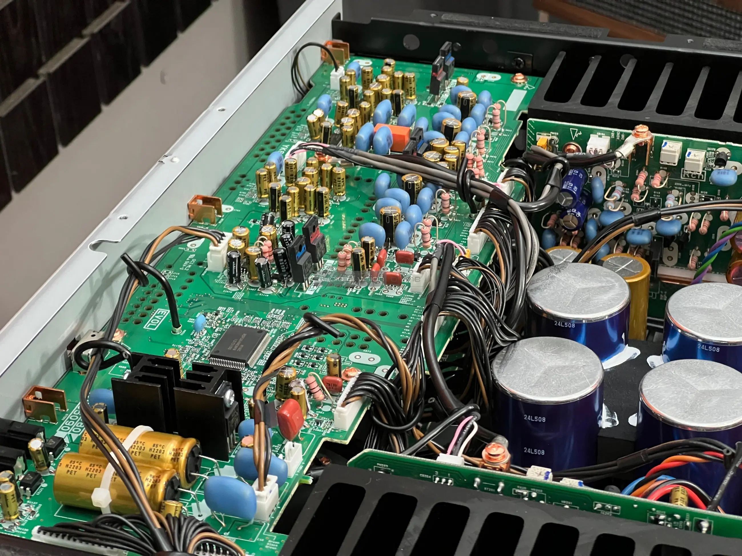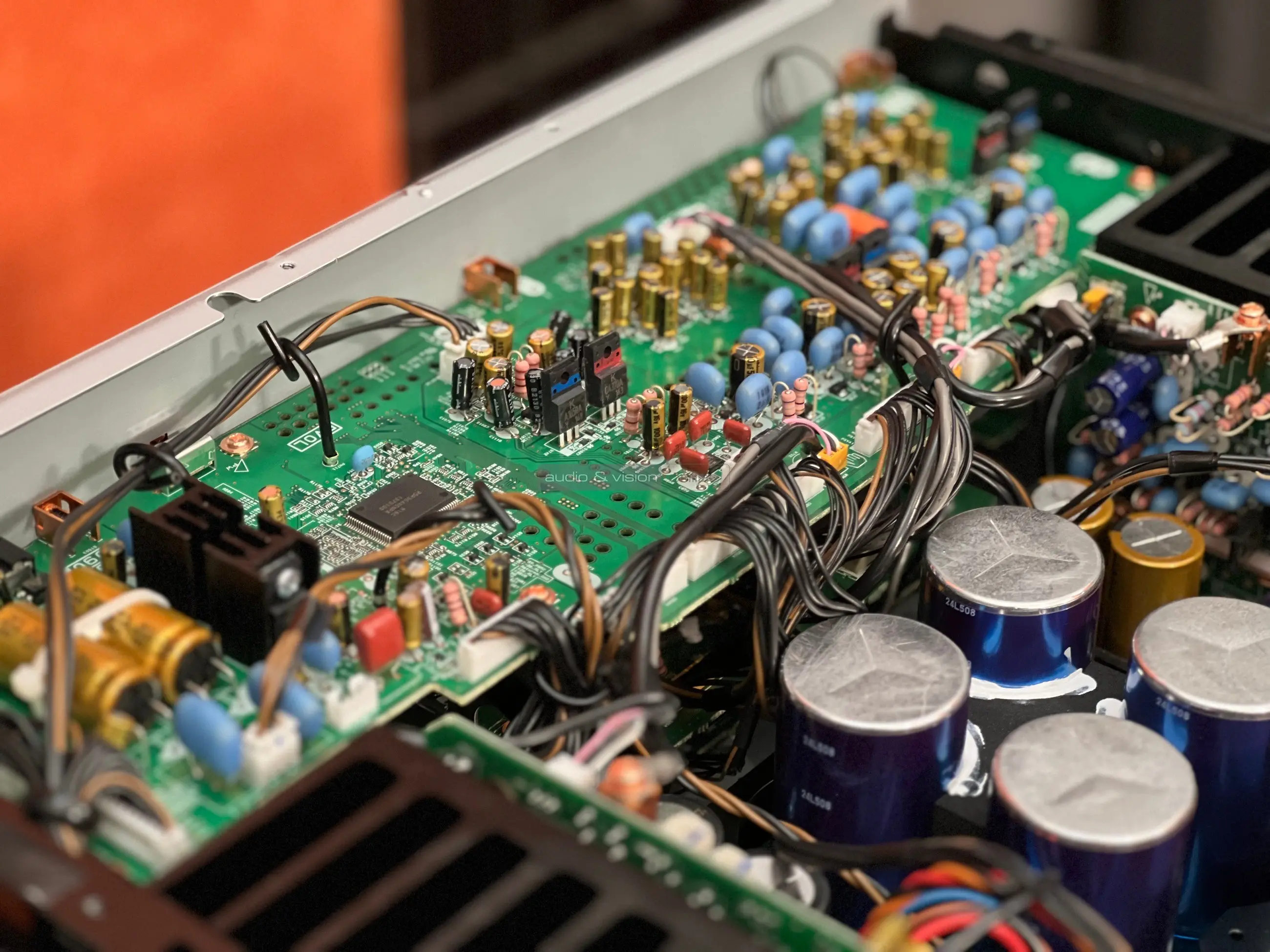 Az A-S1200 teljesítménye csatornánként 150 W 4 ohmon, aminek előállításához 625 VA-es toroid transzformátort alkalmaztak, valamint nem hiányoznak az ezt körülölelő hűtőbordák sem a fabetétek felőli belső oldalakon. A tetőlapot leemelve példás rendet találunk, minden logikusan van elhelyezve, és még némi levegő is jutott közéjük, tehát ebben az esetben valóban indokolt a jelentős kiterjedésű készülékház.