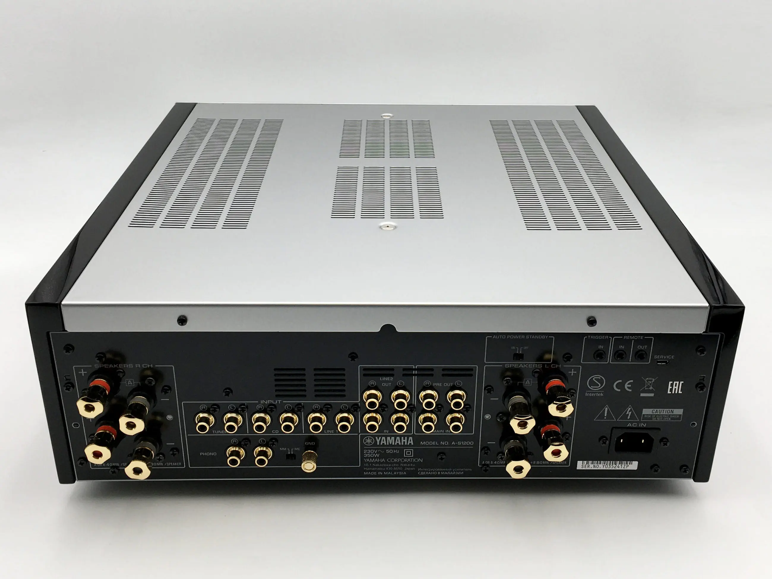 A fekete vagy ezüst kivitelben kapható Yamaha A-S1200 esetében az oldalsó fabetét itt is kizárólag fényes fekete színű lehet, ami a sötét kivitelű készülék esetében nem sokat dob a megjelenésen, a világoson annál inkább. Az ezüstözött fém lábakon nyugvó 22 kg-os, tehát nagyon fajsúlyos készülék fedőlapjának két szélén szellőzőnyílást találunk, amire szükség van, hiszen belül minőségi elektronika és erő lakozik.