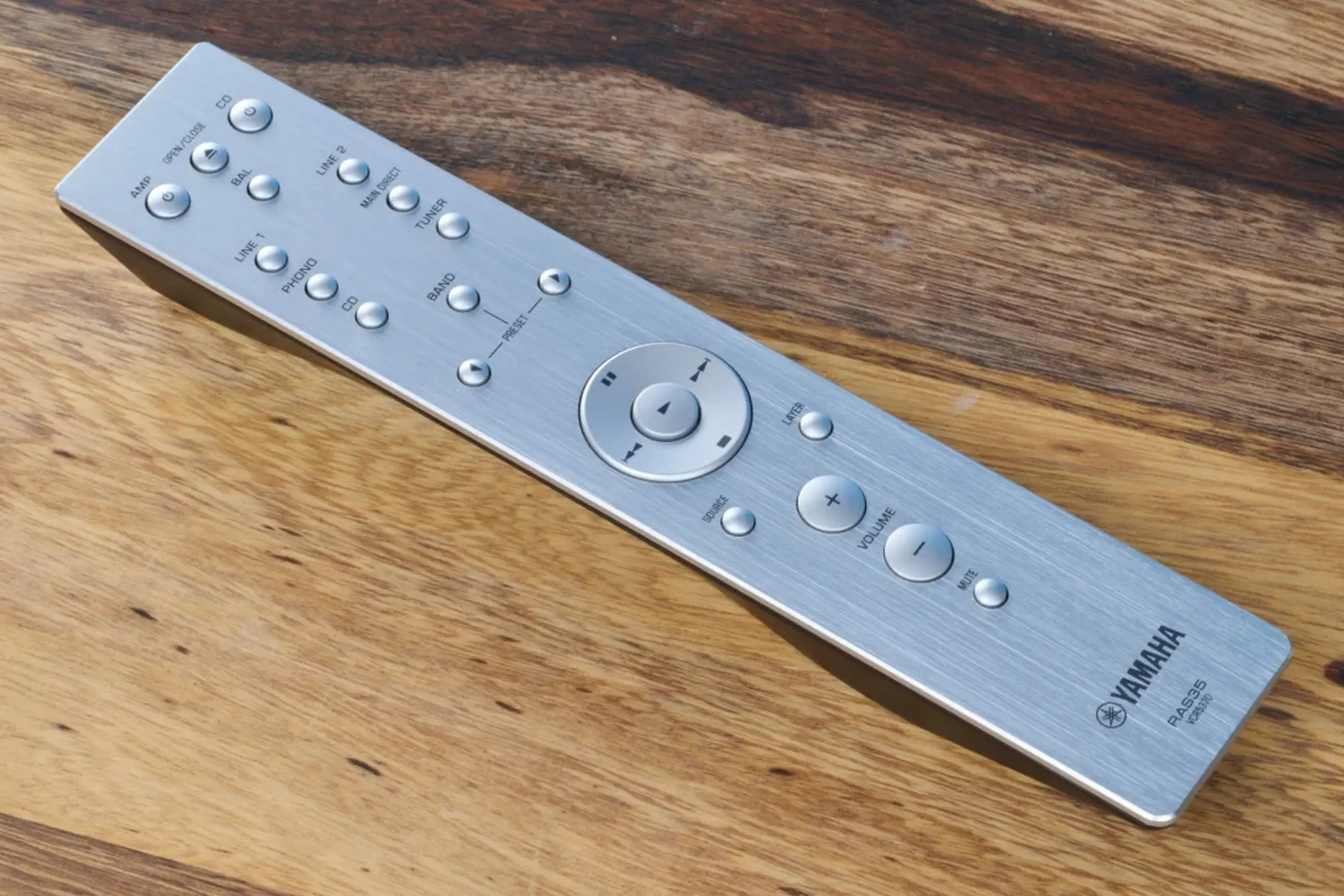 A másik oldalon a bemeneteket tekerőgombbal választhatjuk ki, valamint jutott egy külön némító gomb is még a frontoldalra. Ennyi, semmi több, tehát a lényeg megtalálható, ha nem akarjuk használni, vagy éppen nem találjuk a mellékelt távvezérlőt, ami a Yamahától már ismert darab, ami megfelelő méretű és anyaghasználatú, a gombok logikusak rajta, tehát abszolút könnyen kezelhető.