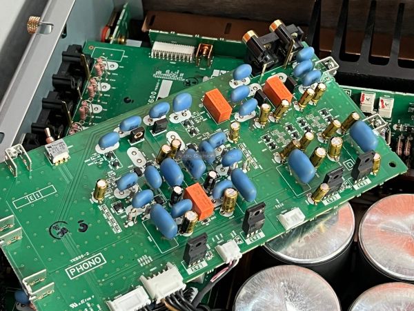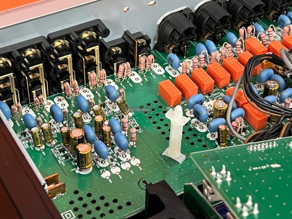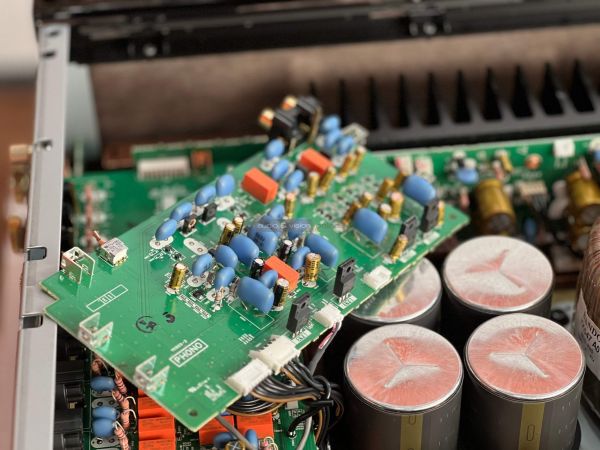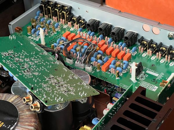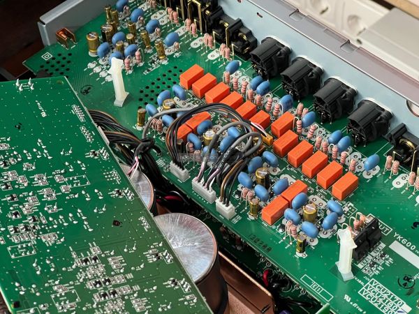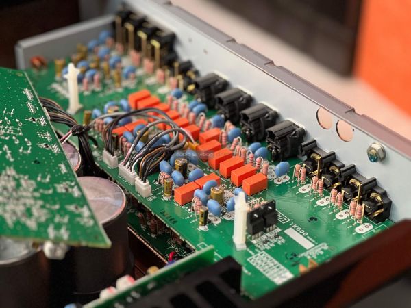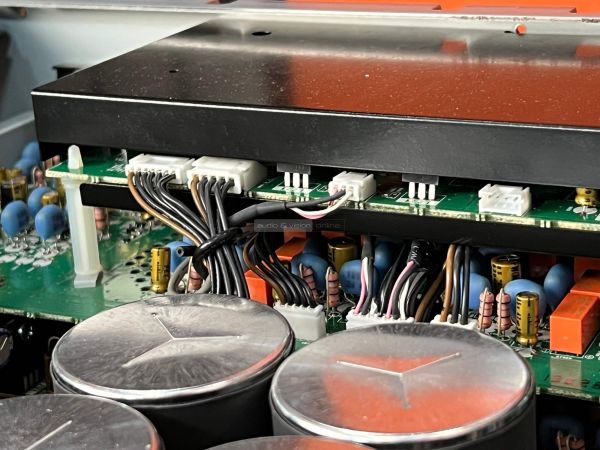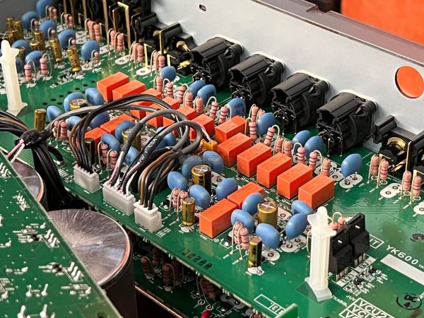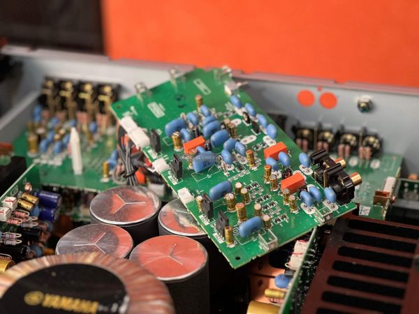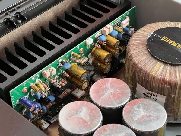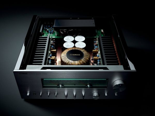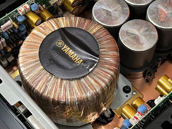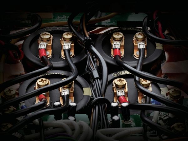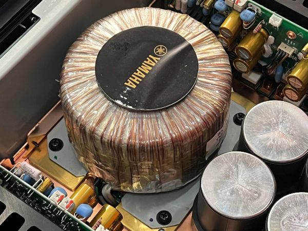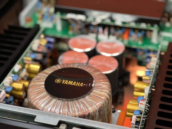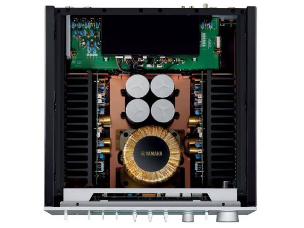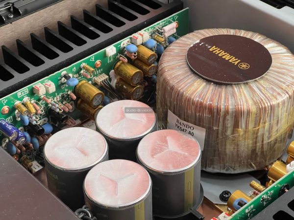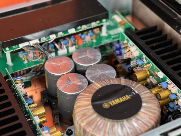 A Yamaha erősítő belsejében szigorú rend uralkodik, ahogyan ezt ebben a kategóriában el is várjuk. A két szélen hatalmas hűtőbordák vannak, közéjük helyezték el a szintén terebélyes toroid trafót, valamint a kondenzátorokat, az előerősítő szegmens pedig külön, szeparált helyen található. Gondos és átlátható a tervezés és a kivitelezés, felesleges időpocsékolás lenne fogást találni rajta. Ezt így kell csinálni high end berkekben, és kész.