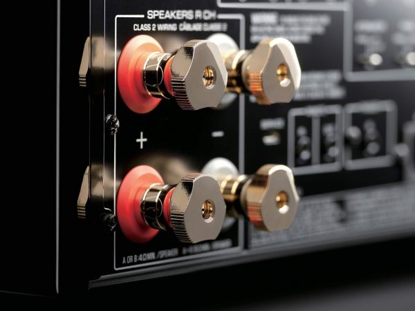 Az igényesség tovább folytatódik hátul, hiszen a két szélen elhelyezett hangfalkimenetek teljesen rézből készültek, és természetesen képesek fogadni a csupasz drótvégeket és sarukat is, amelyek illesztésének segítségéül a Yamaha a csatlakozókba vájatokat helyezett el, tehát sokkal könnyebb tekerni azokat.