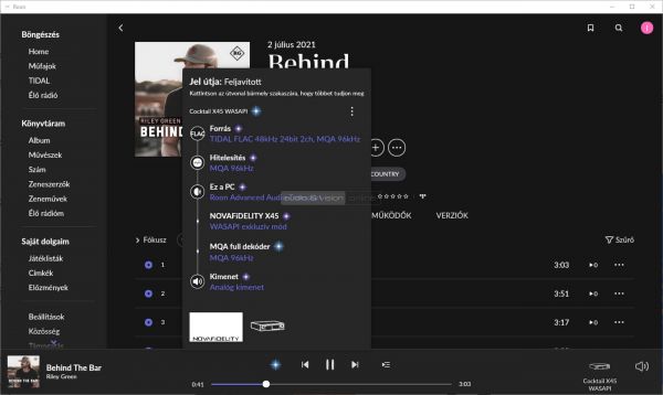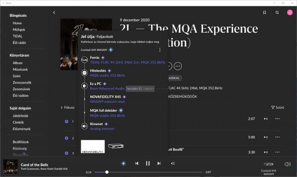 Cambridge Audio 851A és Hegel H120 sztereó erősítő, Topping A90 előerősítő és fejhallgató erősítő, AudioQuest NightOwl Carbon és Sivga P-II fejhallgató, PC, Matrix Audio Element H USB kártya, a szimmetrikus csatlakozón egy AudioQuest Fire XLR kábel, Roon és Jriver lejátszó szoftver.
