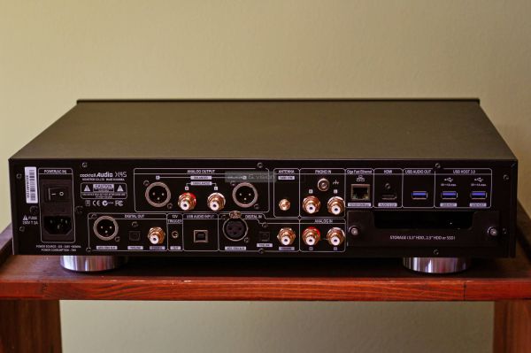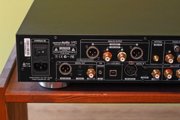 A Cocktail Audio X45 hátuljáról egy rövidebb novellát bízvást lehetne írni, annyi a ki- és bemenet. Balról indulva, egy biztosíték aljzat, egy ki-bekapcsoló, egy szabványos IEC tápcsatlakozó aljzat, három digitális kimenet (AES/EBU, koaxiális, optikai), trigger csatlakozó más Cocktail készülék vezérléséhez, USB, AES/EBU, koaxiális, optikai bemenet. Felette XLR és RCA kimenetek, a DAB és FM antenna nem szabványos csatlakozója, a phono bemenet lemezjátszókhoz és egy pár RCA analóg bemenet áll sorban. A hátsó traktus jobb harmadán a felső részen van még a gigabites Ethernet csatlakozó, egy HDMI kimenet külső monitorhoz és három USB csatlakozó fért még el, alattuk található a simán, két csavar oldása után kivehető fiók, amibe 3,5 és 2,5 colos HDD vagy SSD rakható be, maximum 8 TB tárolókapacitással.