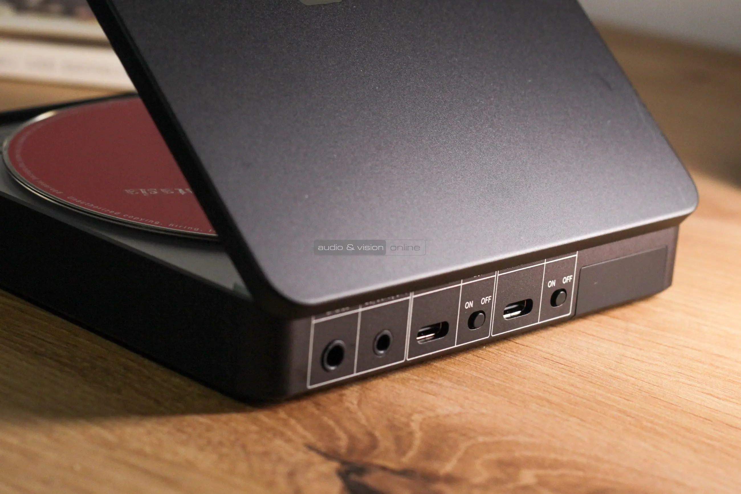 Hátul logikus jelölésekkel sorakoznak a csatlakozók, egy ESP (elektronikus rázkódásvédelem) és D. MODE kapcsoló társaságában. Utóbbi jelentése asztali mód, bekapcsolását követően az akkumulátor helyett USB-ről történik az áramellátás. Tesztalanyunk 4,4 mm-es Pentaconn és 3,5 mm-es Jack vonalszintű kimeneteket nyújt, utóbbi adja a digitális jelet is külső DAC esetén. A fennmaradó két USB-C aljzat áramellátásra, illetve a lemezek (pendrive-ra) mentésére szolgál. Alul négy aprócska gumitalp hatékonyan gátolja meg a síkfelületeken történő csúszkálást.