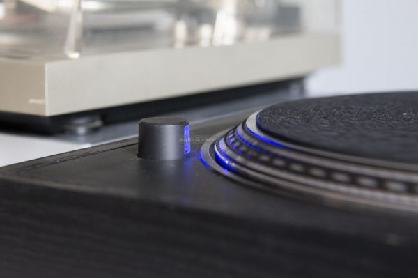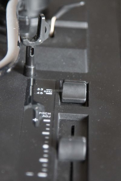 A hangkar mellett jobb oldalon egy csúszka látható, amivel a forgási sebességet változtathatjuk +/- 10 %-kal. Bal oldalon stroboszkóp - a lejátszási sebesség ellenőrzéséhez - illetve a kislemezekhez szükséges középrész átalakító található.