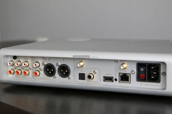 Baloldalról indulva azonnal egy pár RCA MM phono bemenetet látunk, közvetlenül mellette két pár vonalszintű RCA analóg bemenet található. Ezután analóg kimenetek következnek, sztereó RCA és XLR kiosztásban. S/PDIF és koaxiális digitális bemenetek következnek, majd egy USB A bemenet, végül egy LAN csatlakozó zárja a bemenetek sorát. Ugyanakkor két WiFi antenna is csatlakoztatható a készülékhez, így nem vagyunk Ethernet kábelhez kötve a használat során (habár ezzel talán tisztább digitális jelet kaphatunk, mint WiFi-n keresztül). Ugyanakkor megjegyezni szükséges, hogy a SOURCE CD kizárólag 2,4 GHz-es WiFi kapcsolatot támogat, így érdemes lehet ellenőrizni routerünkön, hogy megfelelően van-e beállítva. Mindezeken túlmenően már csak egy főkapcsoló és szabvány IEC csatlakozó található a készülék hátulján. Utóbbi sajnos süllyesztett kialakítású, így a ház peremet képez körülötte; ennek következtében a szabvány IEC készülék dugók ebben elakadnak. Ennek ellenére a megfelelő csatlakozás biztosított, viszont nem lehet teljesen bedugni a csatlakozót, kissé instabil érzetet keltő megoldás ez, ami természetesen kezelhető kisebb méretű IEC dugó használatával.