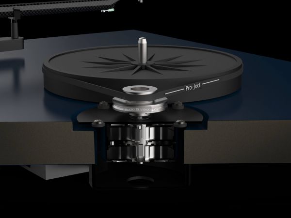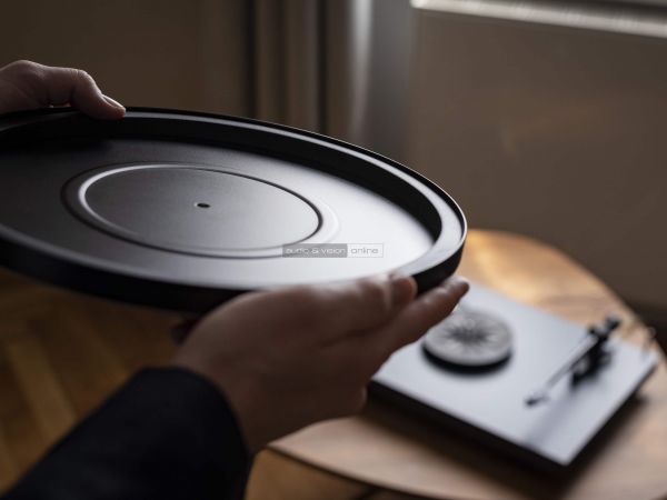 Tovább bontogatva megtaláljuk a lemeztányért, ami egyrészt 1,7 kg tömegű, fémből készült, súlyos darab, másrészt a pereme alatt a Pro-Ject saját fejlesztésű, TPE anyagával csillapított, így rezgésekre kevésbé érzékeny.