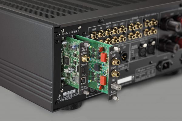 A hátlap bal oldalán találjuk a bővítőkártyák számára kialakított nyílásokat, ahova DAC illetve phono kártyát helyezhetünk, így bővítve erősítőnk tudását. Mivel ezekből kettő áll rendelkezésünkre, nem szükséges választanunk DAC vagy phono egység között, mint például a korábban tesztelt E-270 modell esetében: itt mindkét bővítőkártyát használhatjuk, így tulajdonképpen egy all-in-one készüléket "létrehozva" az E-480-ból.