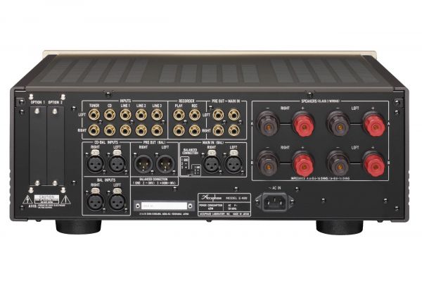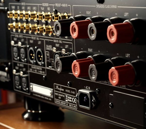 A készülék hátoldalán csatlakozók egész arzenálját találjuk: 6 sztereó RCA és 3 sztereó XLR bemenet, valamint pre és record kimenetek szintén RCA és XLR kivitelben. Ezek mellett méretes, masszív hangsugárzó csatlakozók helyezkednek el, ezekből is kapunk mindjárt 8 darabot, így sztereó kiépítésben erősítésre is lehetőségünk van.