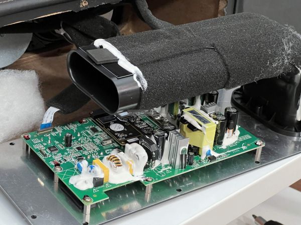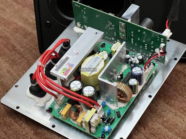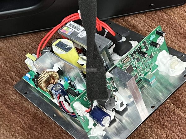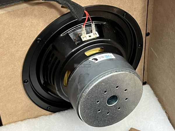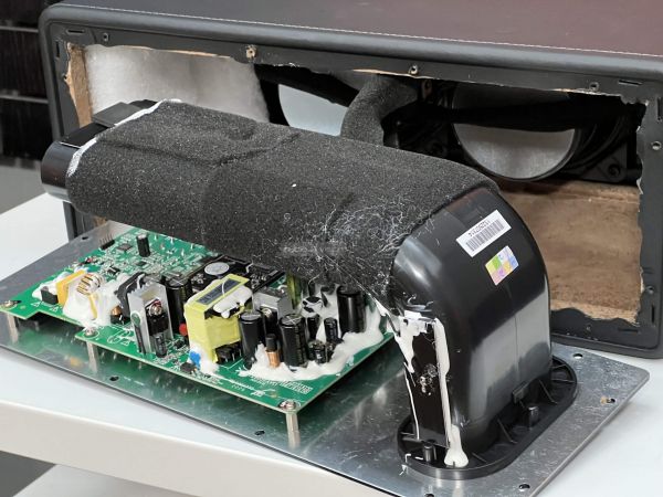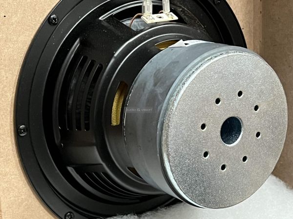 Az alsó, tulajdonképpeni mélyláda stabil, műanyag lábakon nyugszik, ahogyan a felső szekció is, de az utóbbinál az első kettő kicsit magasabb, a hang terjesztése érdekében.