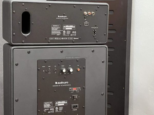 A Drumfire II hátlapjáról még nem ejtettünk szót, de aki ismeri az elődmodellt, sok meglepetés nem érheti. Mindkét komponense basszreflex kivitelű, aminek kimenete ovális, belül pedig hosszú és elkanyarodó csövet alkalmaztak. A mélyládát billenőkapcsolóval kelthetjük életre, lehetőségünk van a keresztváltási frekvencia és a hangerő állítására, a fázis és az automata készenlét állását szintén billenőkapcsolóval oldották meg. A felső szekcióban egy vonalszintű bemenet van, továbbá egy szubkimenet - biztos, ami biztos alapon -, egy szervizmódot nyújtó HDMI aljzat és semmi más, hiszen az Audio Pro szerint nem is kell. Így lehagyták a hátoldali Ethernet bemenetet, valamint a kezelőszerveknél az előd modellnél alkalmazott 3,5 mm-es Jack aljzatot. Ez lehet, hogy kelthet hiányérzetet egyesekben, de az elmúlt évek tapasztalatai alapján született a döntés, mert a felhasználóknak ezek másodlagosak voltak. Ezen az alapon megemlíthetnénk azt is, hogy analóg lemezjátszó sem köthető rá, de az Audio Pro ebben az esetben nem pártolja a zenehallgatás ilyen változatát. Végtére egy aktív Bluetooth rendszerrel van dolgunk, ami multiroom szolgáltatás terén is igazán sokrétű, ráadásul érdemes megjegyezni azt is, hogy más, cégen belüli, akár hordozható hangszóróval is könnyedén fel tudja venni a kapcsolatot, tehát a kombinálás tényleg csak rajtunk múlik.