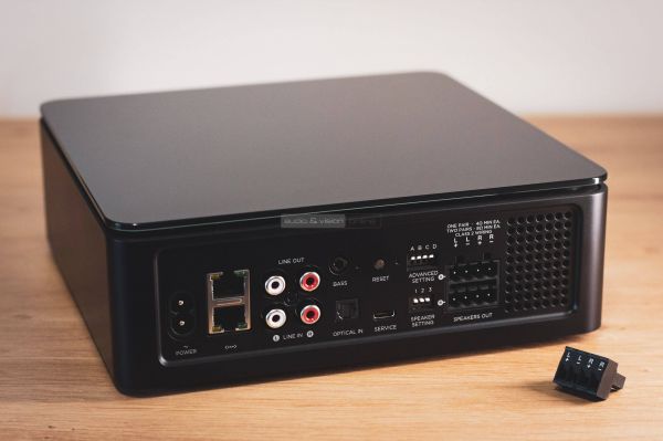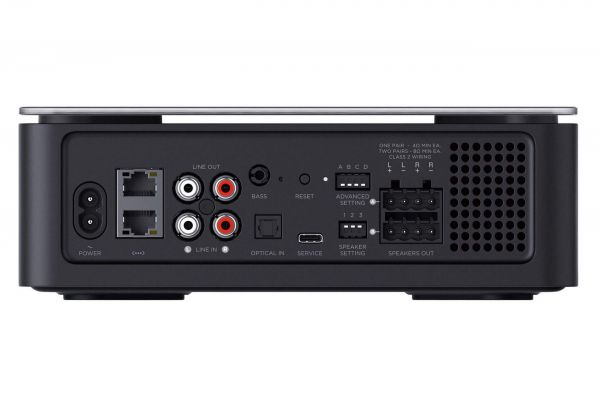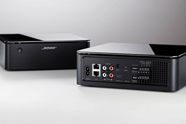 Az erősítő hátulján IEC-C7 (piskóta, magnó, borotva) tápkábel csatlakozót találunk és kettős Ethernet aljzatot. RCA be- és kimenetet is tartalmaz. A BASS feliratú Jack kimenet kifejezetten arra szolgál, hogy a Bose Bass Module aktív mélysugárzót lehessen rá igény esetén csatlakoztatni. Emellett egy optikai bemenet zárja a sort és néhány kapcsoló, amelyekkel különböző üzemmódok érhetők el (bővebben később). A hangfalkábel csatlakozók installációs kivitelűek, csavarozós rögzítéssel. Hátránya, hogy legfeljebb 1,5 négyzetmilliméteres kábelt fogadnak, azt is szenvedősen (inkább 0,75 ami kényelmesen belefér). Előnye, hogy ha egyszer bedugtuk a kábelt, kicsi az esély rá, hogy kimozduljon helyéről.