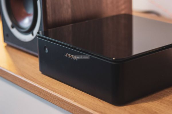 A Bose Music Amplifier kicsi, lapos, könnyen elfér falipolcon, médiabútor sarkán és számos szűkös helyen. Rendhagyó részlet, hogy előlapján mindössze egyetlen gomb, a Bluetooth párosító található. Még ki-bekapcsoló sincs. Hálózatos erősítőként folyamatosan készenléti állapotban tartható akkor is, ha nem szól rajta a zene. Amint parancsot kap a hálózaton keresztül, rögtön megszólal. Visszatérve a külső motívumokra, tetején dekoratív üveglap fénylik. Szép, bár könnyen porosodik, de legalább feldobja a műanyag oldallemezt. Az alváz fémből készült és lapos gumi lemezeken áll.