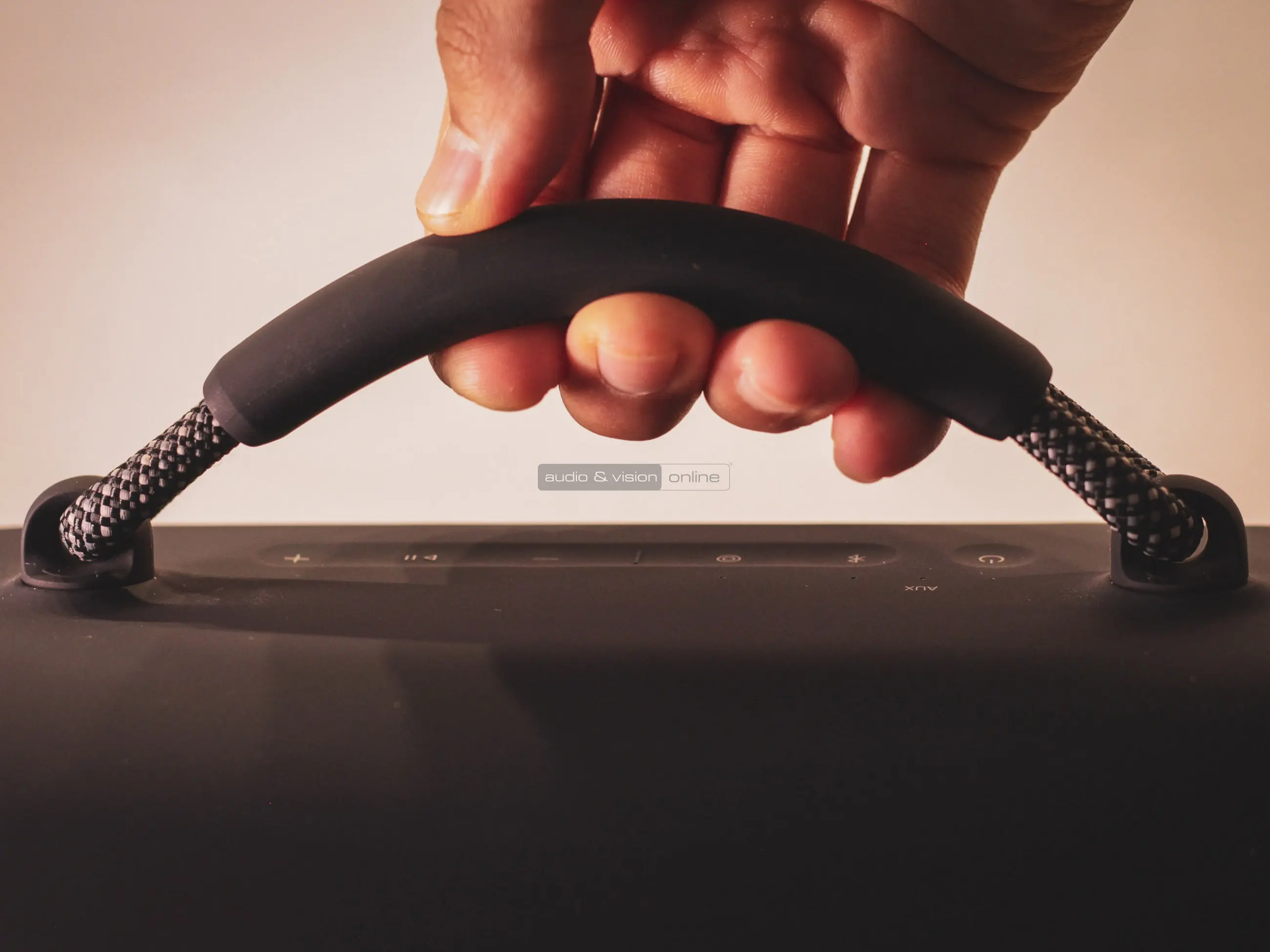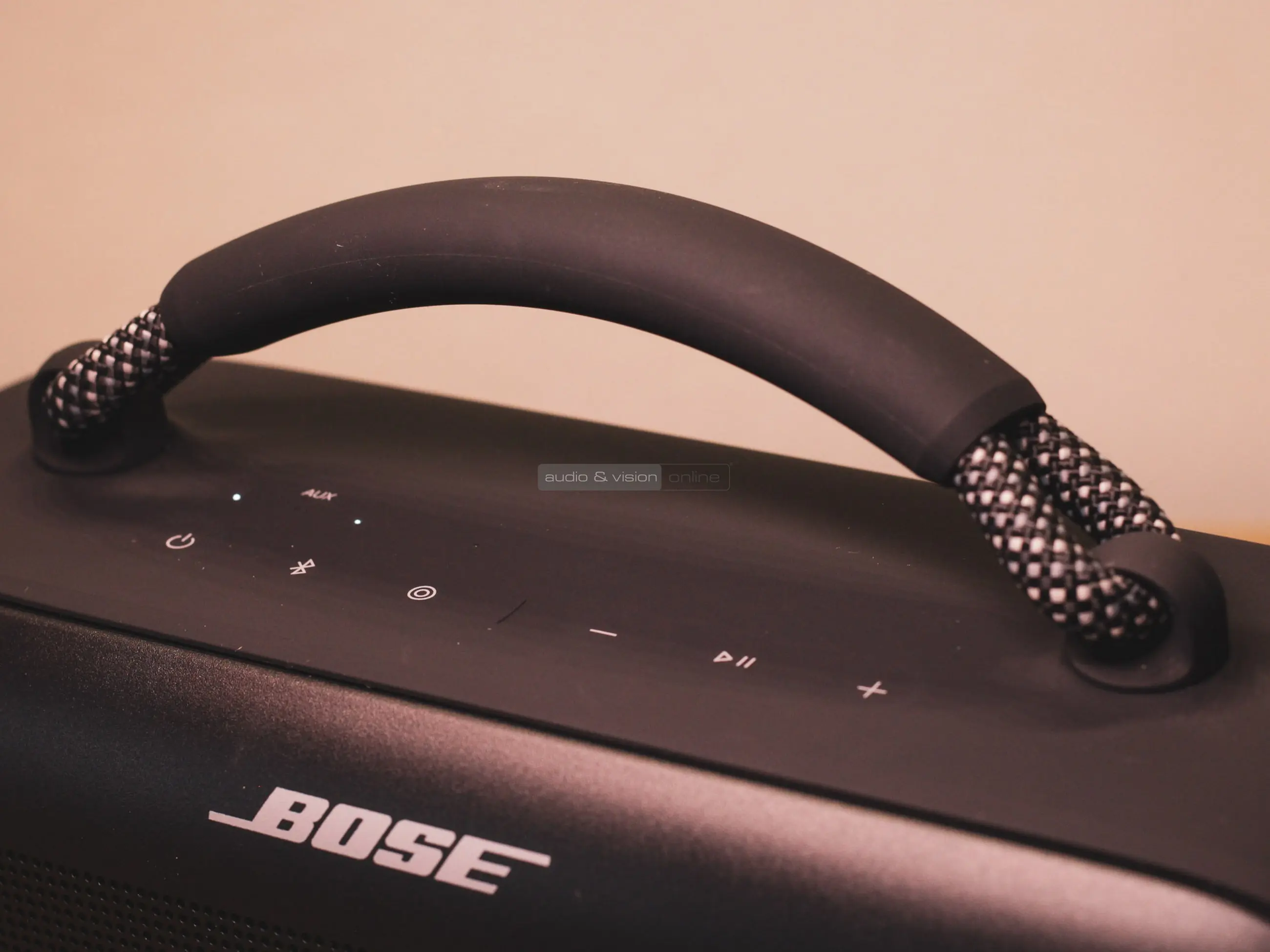 A hangszórókat elegáns hatású fémrács mögé rejtették. Ezen és az emblémán kívül nem találtunk mást az előlapon. Fent, a fogantyún kívül hat nyomógomb sorakozott. Használatukkal tudtuk elvégezni az összes szokásos parancsot, ki és bekapcsolástól a zenei navigációig. A süllyesztett gombok szinte teljesen némán, lágy fizikai reakcióval működtek, de könnyű volt mindegyiket kitapintani még csukott szemmel is. A doboz hátuljára egy 3,5 mm-es Jack bemenet került, USB-C csatlakozó társaságában. Utóbbival tudtuk tölteni a SoundLink Max akkumulátorát és akkubank funkciót is kaptunk, a hangrendszer is töltötte a hozzá csatlakoztatott okostelefont.