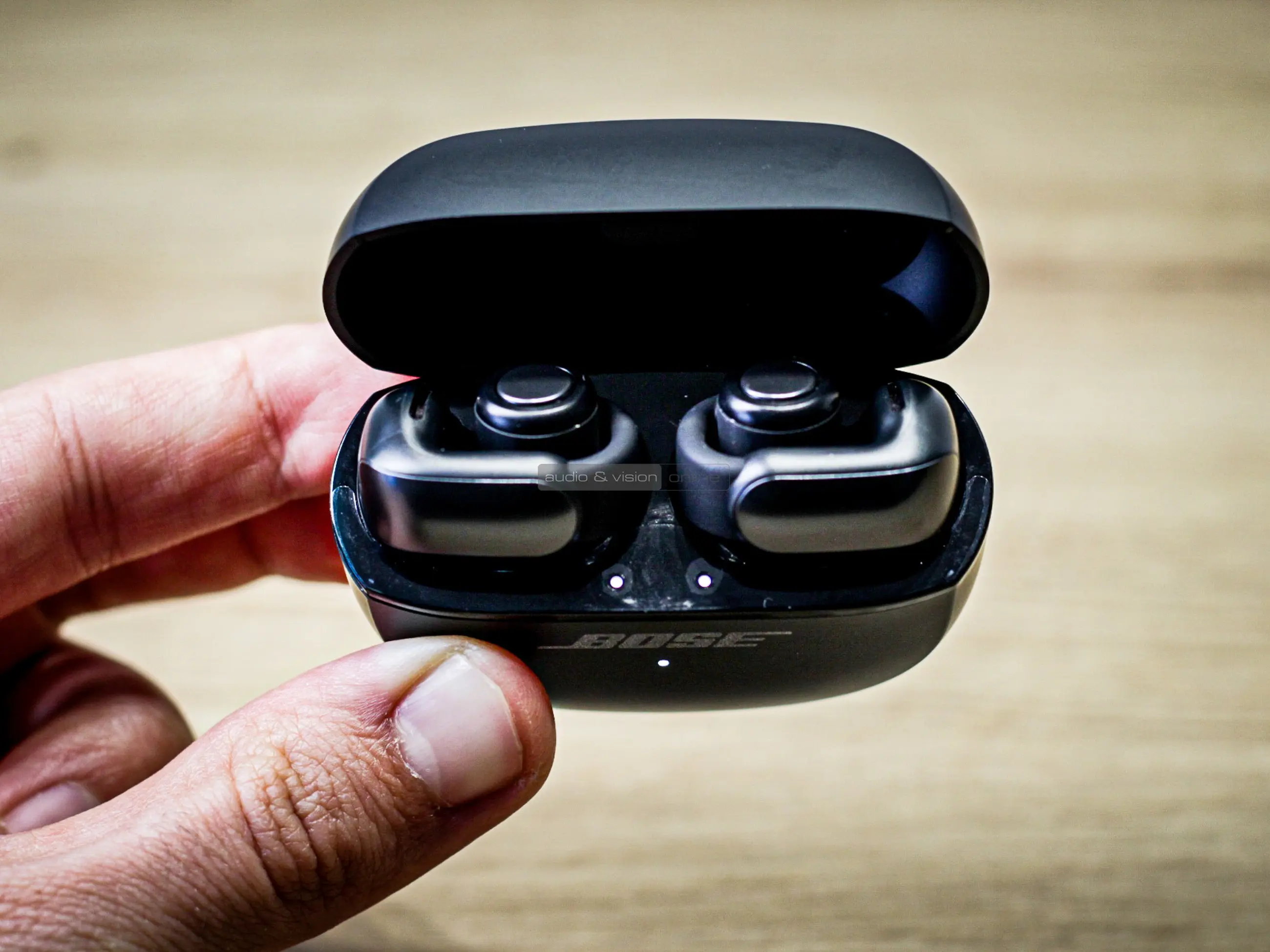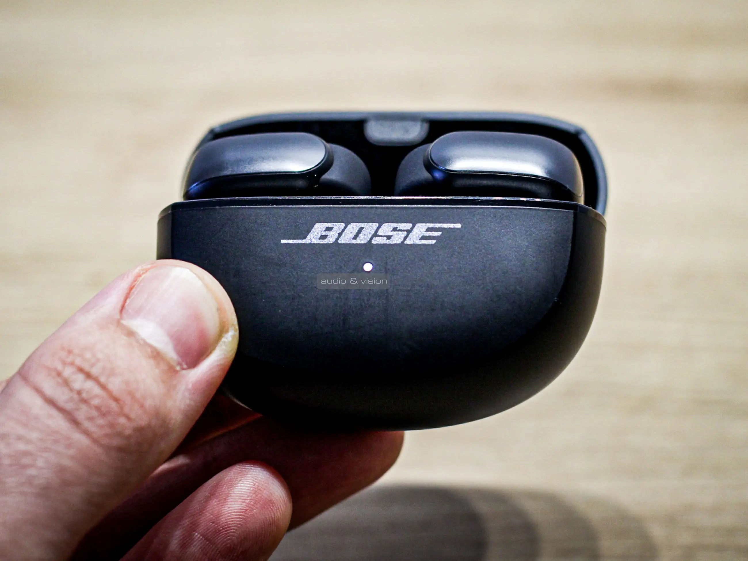 A fülhallgatót kisméretű, szinte bármilyen zsebben elférő tok egészíti ki. Tipikusan Bose jellegű, műanyag, de jó minőségérzettel, selymes tapintással és rejtett mágnesek által határozottan lecsapódó fedéllel. Alján USB-C csatlakozó segíti a töltést (vezeték nélkül nem töltődik), a hátulján pedig egy mélyített, kerek gomb benyomása elindítja a Bluetooth párosítást. A fedél felnyitását követően három LED mutatja a jobb és bal fülhallgató, valamint a tok akkumulátorának töltöttségi szintjét.