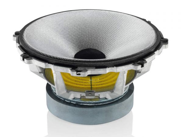 A Bowers & Wilkins 607 S2 Anniversary Edition 130 mm-es mélyközépsugárzójának membránja FST Continuum fantázianévre hallgat, annak színe fémes, csillogó, csak a porvédő sapka és a gumiperem fekete, így a kontraszt látványos, ugyanakkor nem feltétlenül divatorientált. Korábban is alkalmazták ezt a megoldást, amikor még a kevlárt használták alapanyagként, aminek a sárga színét kellett valahogyan hétköznapibbá tenni, finomítani.