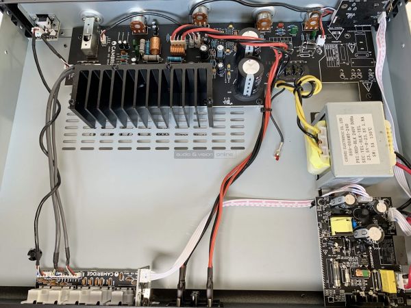 A készülék szürke előlapja - amely színt a Cambridge Audio most egységesített minden készülékén - fekete vázzal társul, aminek a tetején szellőzőnyílások is találhatók. Érdekesség még a talp, ami hátul kettő darab, elől viszont egybefüggő, vízszintes és ívelt műanyag egység. Az utóbbi a vastagabb frontoldal teljes alátámasztására hivatott. Találkoztunk már 100 ezer forint alatti erősítővel, és tulajdonképpen mindegyik tisztességesen szerepelt, egyes esetekben még egyéni hangképpel is rendelkezett.