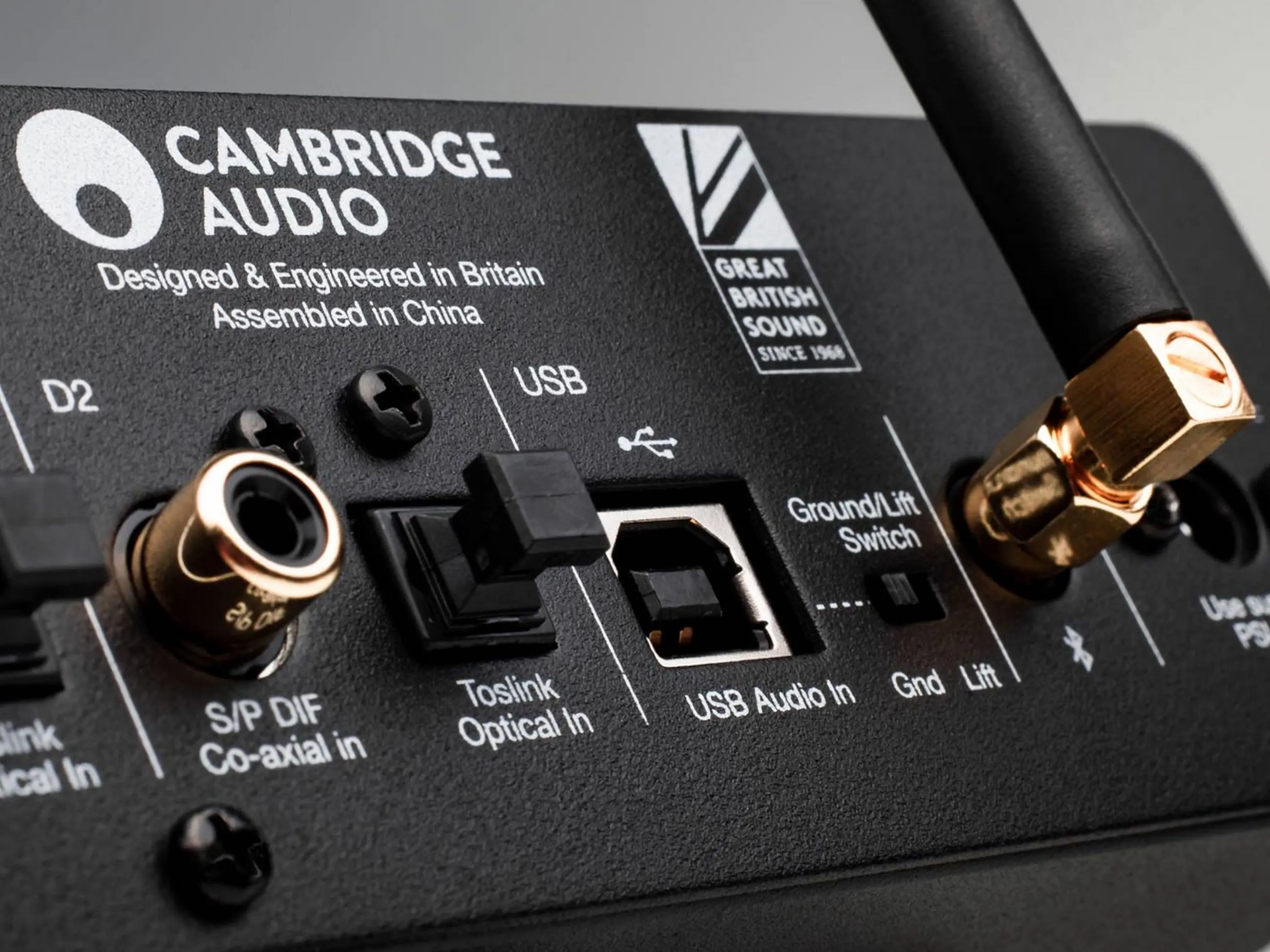 Hátulján a már említett XLR kimenet az RCA-k mellett, koaxiális, optikai mindegyikből 2-2 db, USB és egy 12 V DC 2 A bemeneteket találjuk és a ma már kihagyhatatlan Bluetooth antennát. Minden eshetőségre számítva még egy Ground (föld) tologatható kapcsolót is odapakoltak a mérnökök, hátha zajos/brummos az USB csatlakozás, ezzel elméletileg ki lehet küszöbölni.