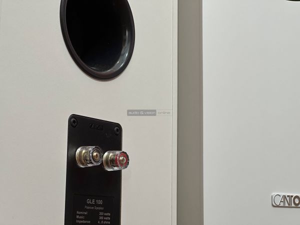 A Canton GLE 100 egy háromutas basszreflex konstrukció, amely három színben, makasszárban, matt feketében vagy szatén fehérben kapható, mi egy fehéret teszteltünk. Amikor először pillantja meg valaki a hangdobozokat, azonnal szembeötlik az arányos, de meglehetősen nagyméretű test. A 116 centiméteres magassághoz 24 cm-es szélesség és 40 cm mélység társul, a tömege 33 kg. A reflexnyílás a hátoldalon és közvetlenül a szimpla kábelezést kínáló csatlakozók felett található, a stabilitásról az alaplemezbe csavarozott 4 db masszív láb gondoskodik, amelyek aljára filc került, ezért nem karcolják meg a padlót.