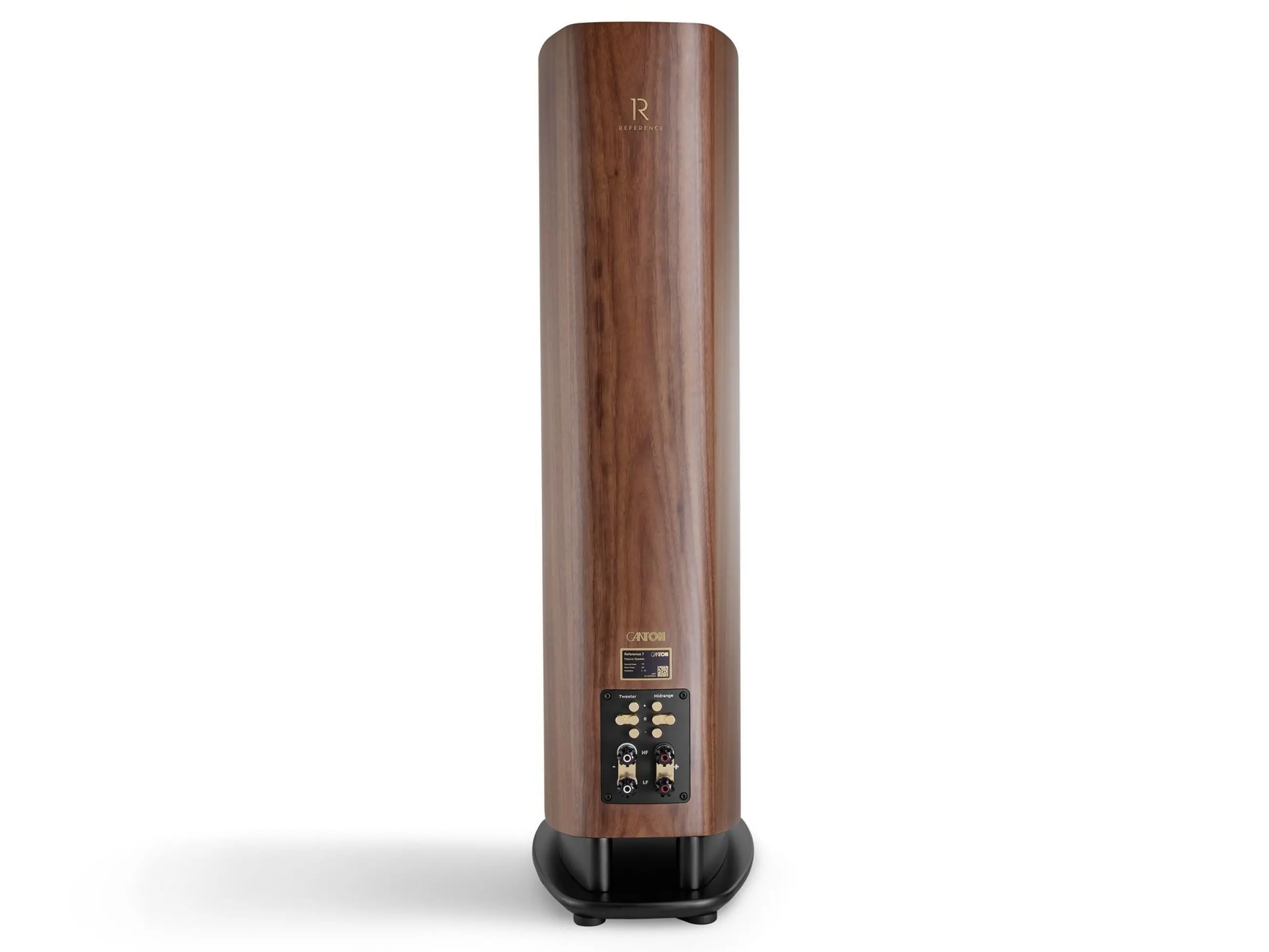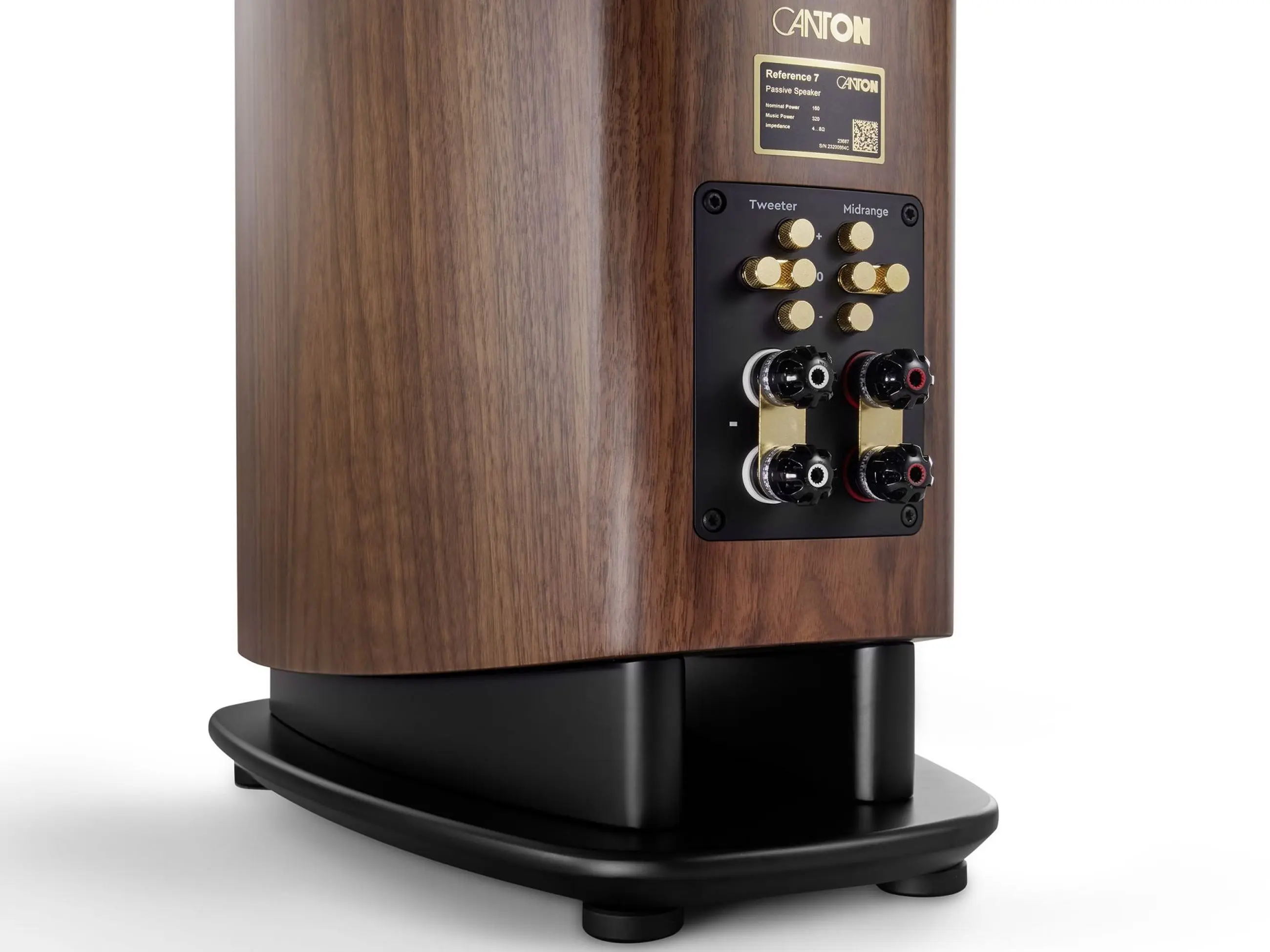A Canton New Reference 7 háromutas, basszreflex hangfal, két kimenete van a fixen rögzített talp elején és hátulján. Ez, bármelyik színvariánst is válasszuk, marad fekete, ami ad egy pluszt a megjelenés terén is.