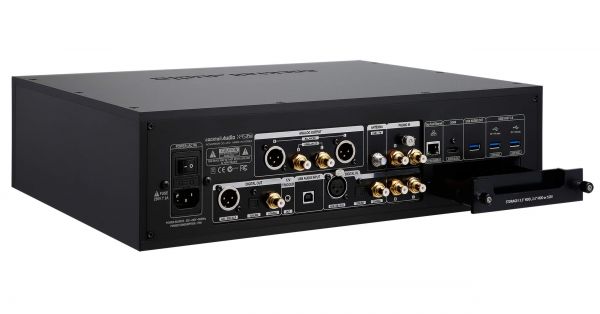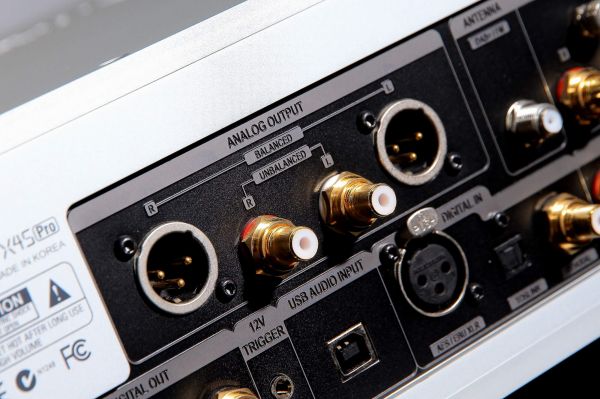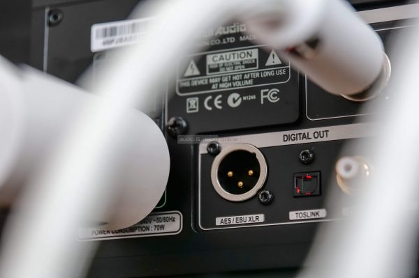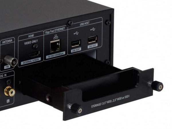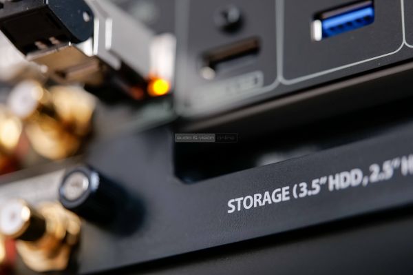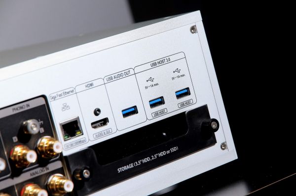 A hátlap kifejezetten impresszív, mondhatni az árkategóriának nemcsak megfelelő, hanem azon túlmutató. Bal oldalon az IEC csatlakozó és a be/kikapcsoló mellett rögtön a digitális kimeneteket (AES/EBU, optikai, koaxiális) találjuk, ezért a még jobb minőségű, külső D/A konverterek használata is lehetséges. A 12 V-os trigger kimenet majd az USB digitális bemenet következik, külső streamer vagy számítógép/laptop USB-n is csatlakoztatható. A további digitális bemenetek (AES/EBU, optikai, koaxiális) után egy pár analóg RCA bemenet is helyet kapott, mellette pedig egy 8 TB kapacitású HDD-t vagy SSD-t befogadó slot is rendelkezésre áll. Utóbbi felett 2 db USB 3.0 bemenetet, egy-egy USB és HDMI kimenetet találunk, az utóbbi audio vagy monitor kimenetként is használható. A LAN és a phono RCA bemenet/földelő csatlakozó, majd a DAB/FM antenna bemenet után az analóg RCA és XLR kimenetek zárják a sort, mindegyikük megfelelően nagy távolságra van egymástól, ezért a nagyobb méretű csatlakozókkal szerelt összekötő kábelek használata is lehetséges.