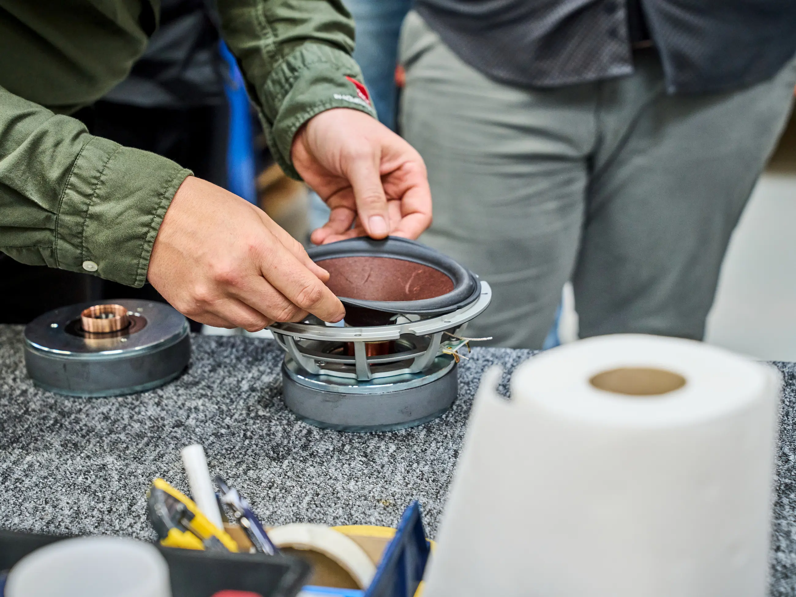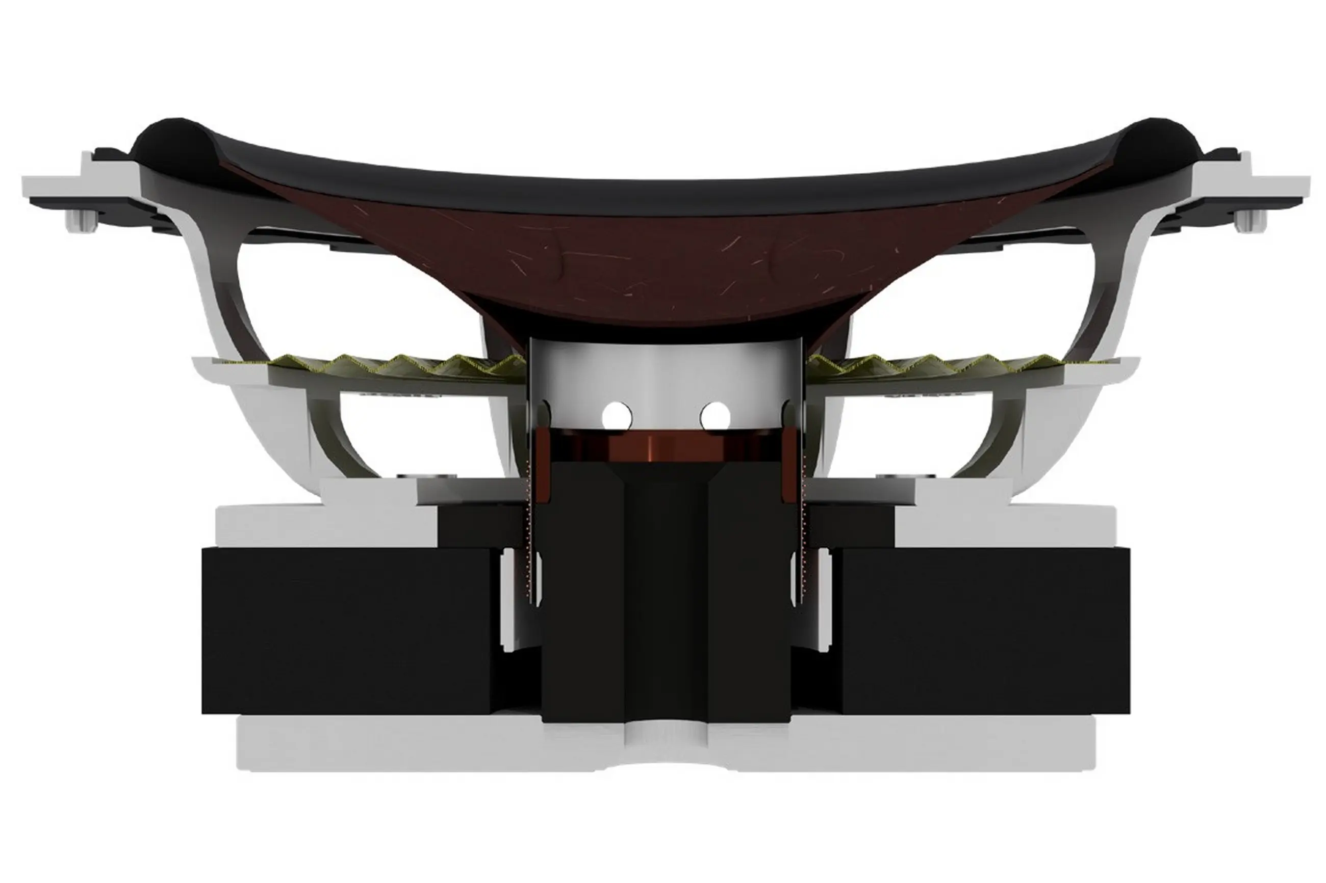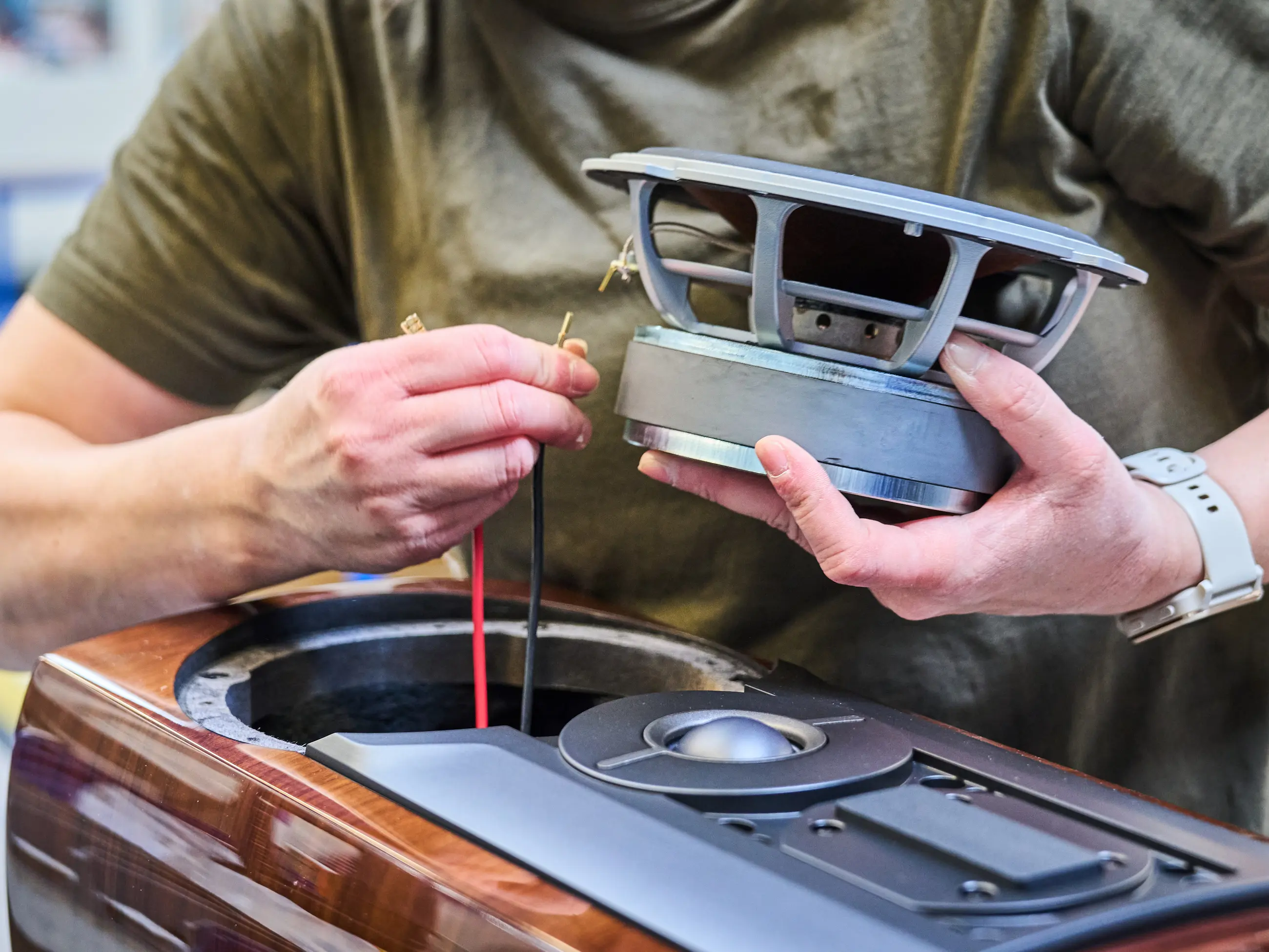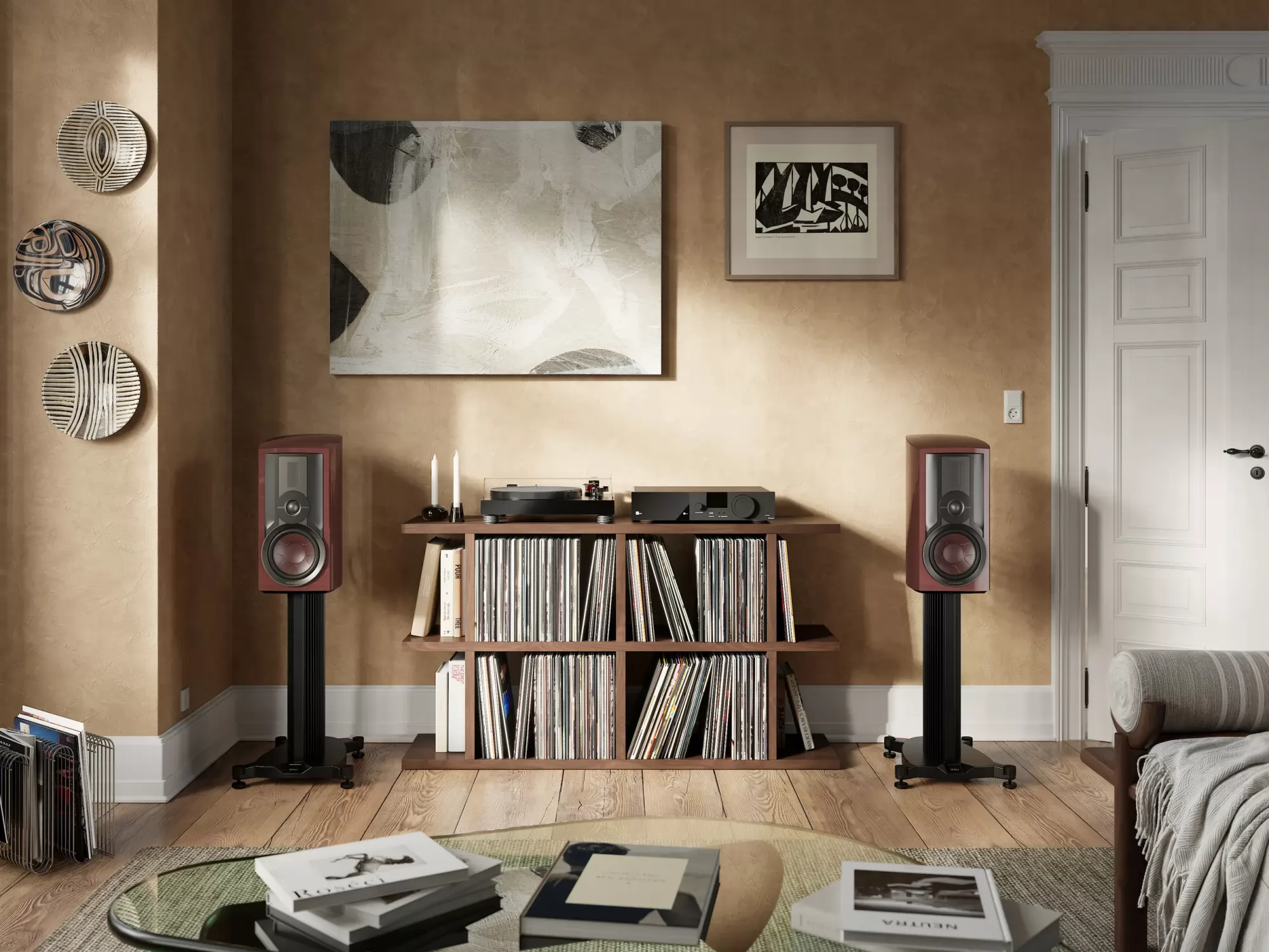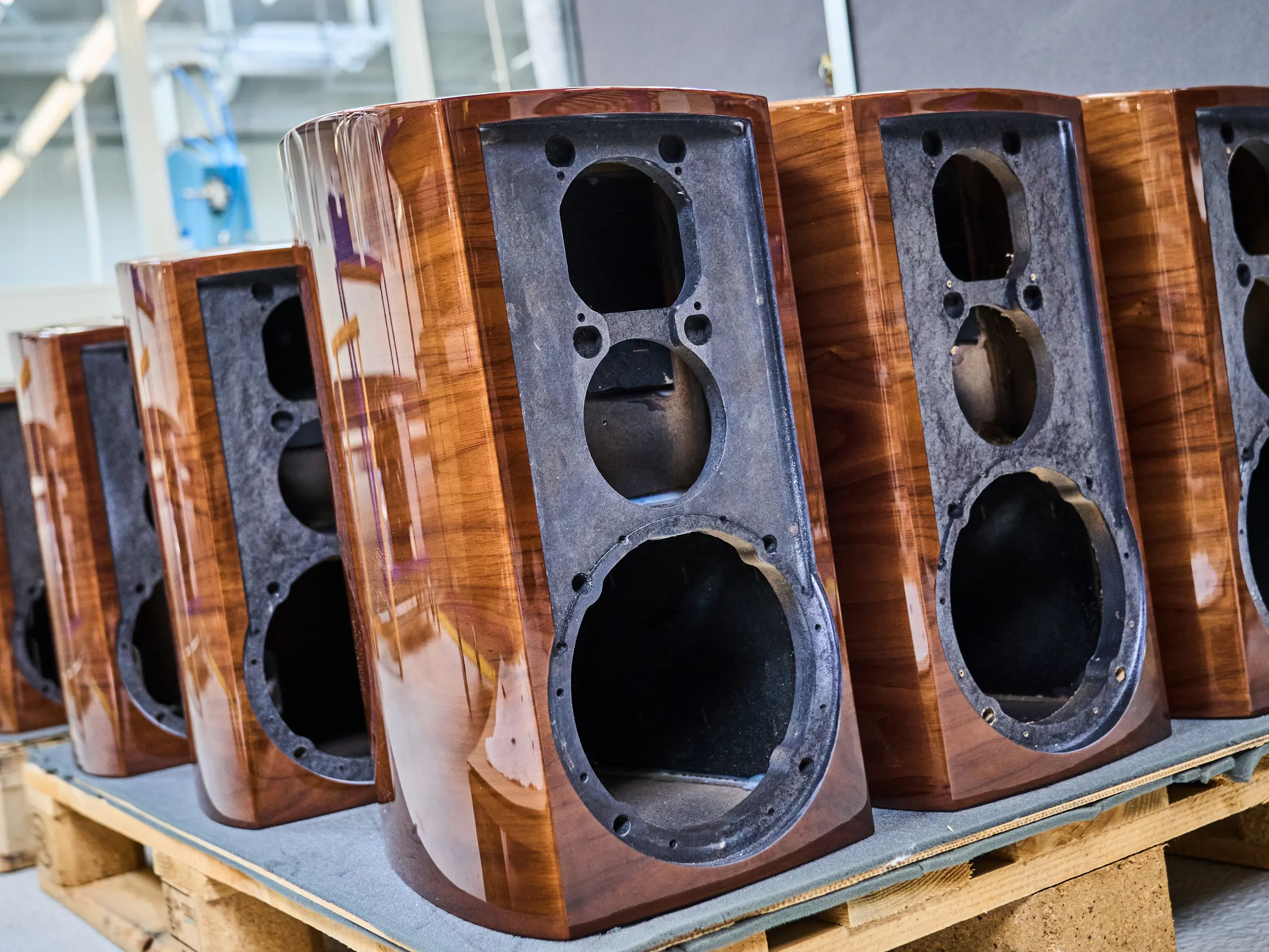 Gyönyörű a hangdoboz, válasszuk bármelyik színben is a magasfényű fekete, vörös vagy dió közül, és az egymással párhuzamos oldallapokat is elfelejtették, hiszen a test hátrafelé szűkül, a teteje pedig szép ívben megemelkedik. Valódi fafurnért használtak a dán mesteremberek, valamint vastag MDF-et, ráadásul belül is, a megfelelő merevség érdekében, így könnyen összejött a darabonkénti 16 kg-os súly, ami nem csekély.