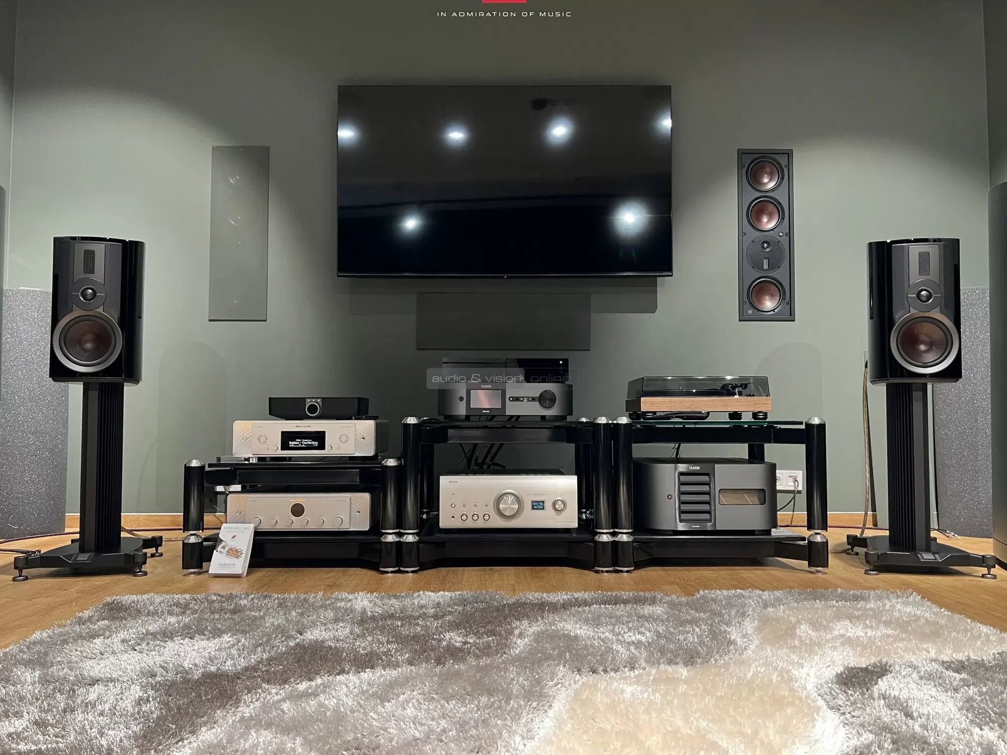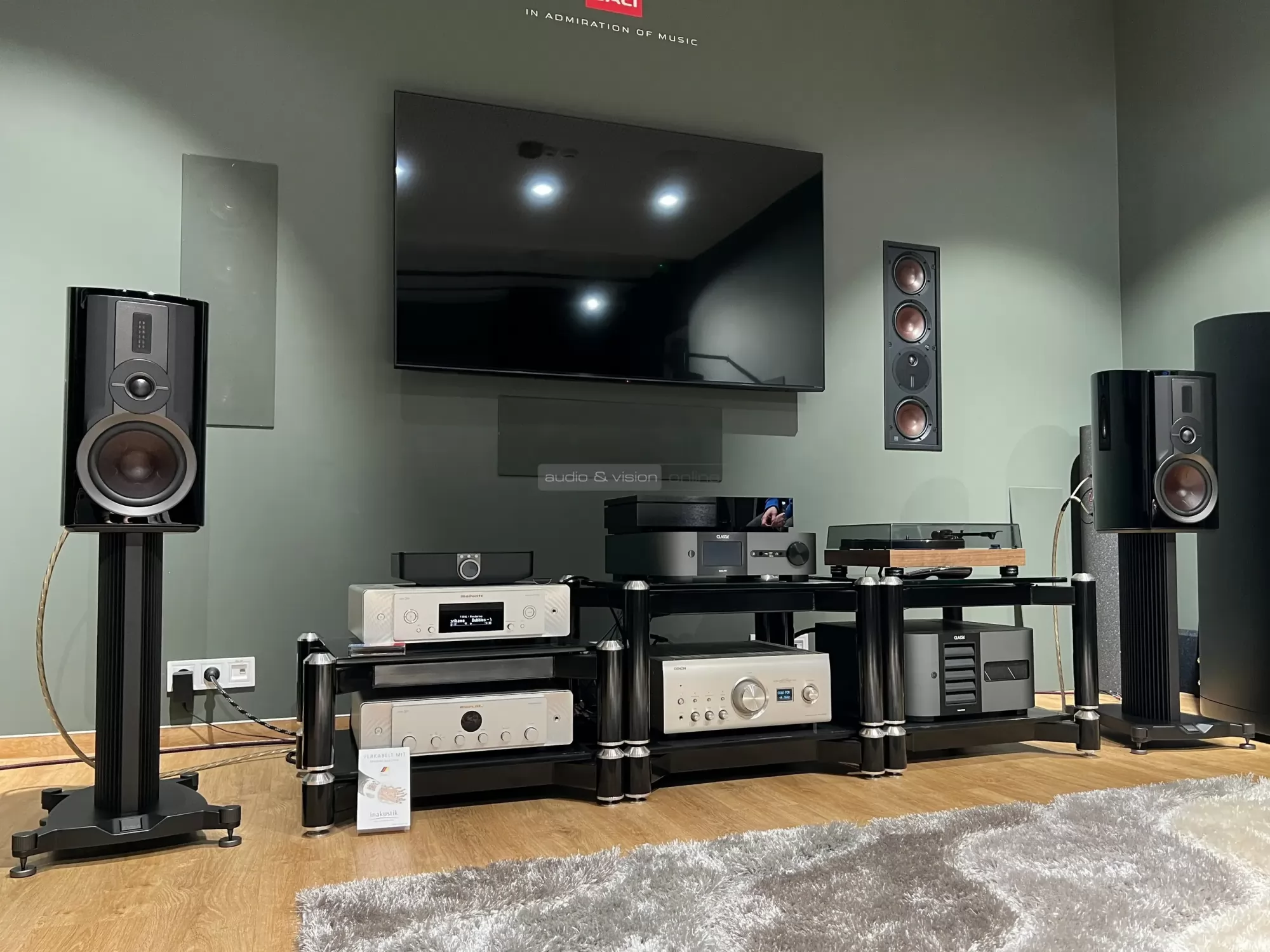 Az Audio Forum DALI szobájában mindkettő a rendelkezésünkre állt, tehát már csak a megfelelő elektronikákat kellett kiválasztanunk. A Marantz SACD30n jelforrásként tökéletesnek bizonyult most is, erősítő terén viszont nem ettől a márkától választottunk, nem is a Naim-től, és még a Classé nagyvadja sem bizonyult a legmegfelelőbbnek. Maradtunk a Denon PMA-3000NE típusánál, ami elég ütős egyéniség, és ez állt a legközelebb a DALI kicsit puhább, édeskésebb karakteréhez. Létrejött tehát a szimbiózis, következett végre a meghallgatás, amit nagyon vártunk, mert ilyen kategóriájú DALI hangfallal már nagyon régen volt dolgunk, pontosabban szerencsénk!