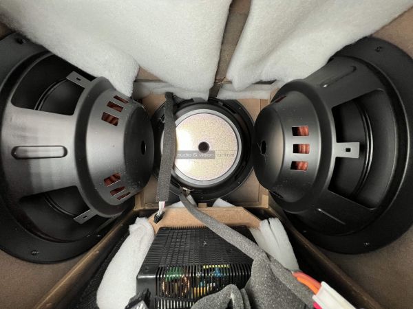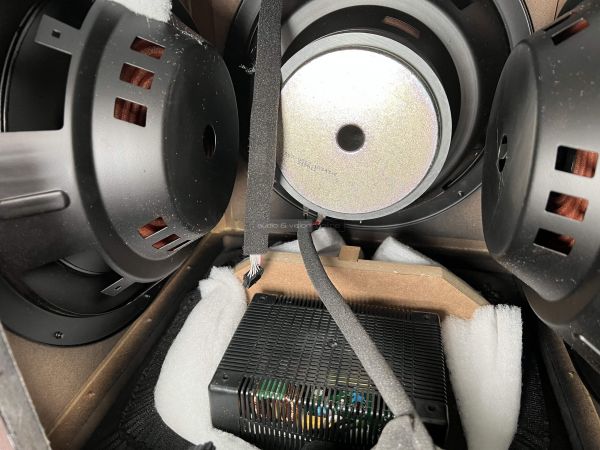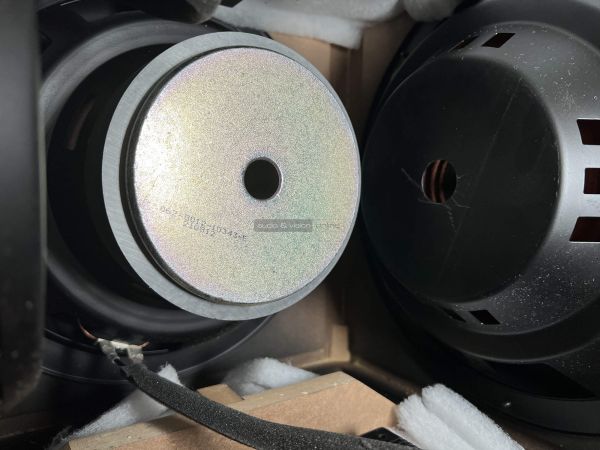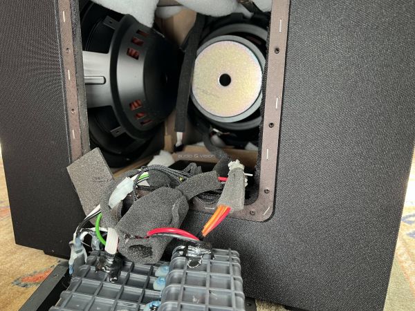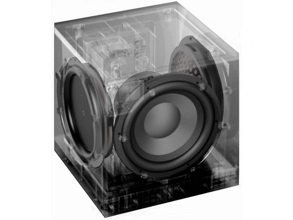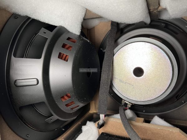 A hatalmas porsapkájú (ezt a szövetburkolaton közvetlen közelről átvilágítva sikerült megállapítanunk) aktív hangszóró membránjának anyagát tapintás alapján papírnak nevezzük, a másik kettő minden bizonnyal polipropilénből készült. A kosarak anyaga fémlemez, a mágnes nagy átmérőjű és dupla, a kábelezés végre nem cérnavékony.