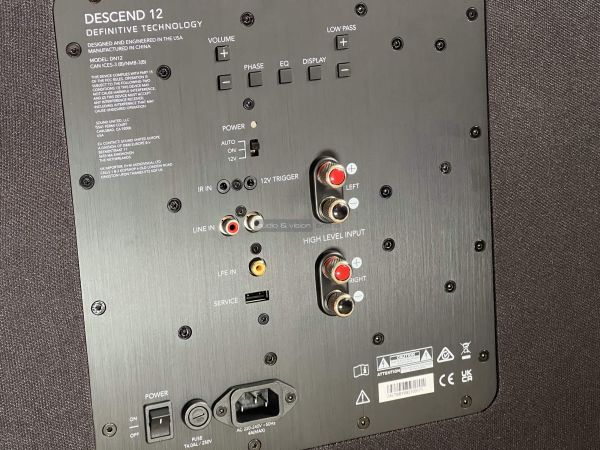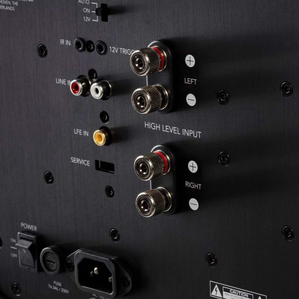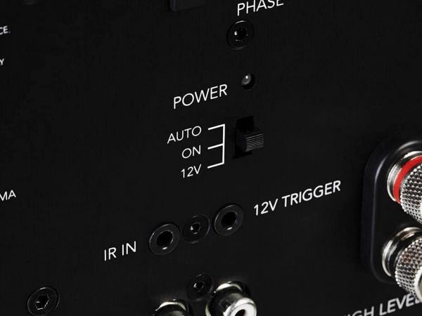 Örültünk a külön LFE bemenetnek, ami a csak szerviz célokat szolgáló USB aljzat fölött helyezkedik el. Nem megszokott a működést szabályzó kapcsoló AUTO és ON alatti harmadik, 12 V feliratú állása. Amikor trigger vezetéken adunk a szubláda számára be- és kikapcsolási parancsot, akkor kell oda billenteni a kis pöcköt.