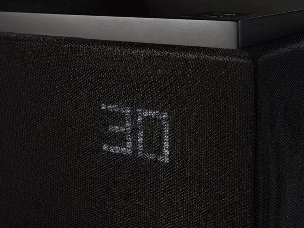 Újabb különlegesség a frontoldal jobb felső sarkában - a szövet alatt - elhelyezkedő kijelző, ami a hangerő állását, a kiválasztott EQ görbe nevét (flat, deep, loud), az aktuális fázist, némítást (MUTE) mutatja, változtatható fényerővel, jókora karakterekkel. Ez nem zavaró, ellentétben a hátlapi LED-del, ami működés közben állandóan, erősen megvilágítja a mögötte lévő területet, falakat. Ezen egy szigetelőszalag darabkával könnyedén lehet segíteni, illetve halványítani.