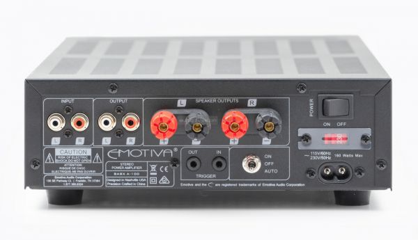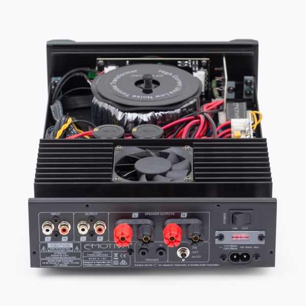 A masszív alumínium előlapon csak egy hangerőszabályzó, és egy 6,3 mm-es fejhallgató csatlakozó díszeleg, és bizony a hátlap vizsgálatára sem megy rá az esténk. Itt találtunk egy-egy pár analóg (RCA) be- és kimenetet (végfokhoz), két pár banándugós hangsugárzó kábel csatlakozót, egy rendszerbe kötést megkönnyítő trigger csatlakozót, egy készenléti billenő kapcsolót, valamint egy automatikus ki-be kapcsolót mely a bejövő jelre éleszti fel a készüléket. Sajnos az A-100 csak borotva (piskóta) csatlakozós tápkábellel üzemel, de felfoghatjuk úgy is, hogy legalább cserélhető, s ezáltal bizonyos kereteken belül fejleszthető is. A tárgyilagos ismerekedés után, nagyon kíváncsiak lettünk a kis Emotiva hangjára is.