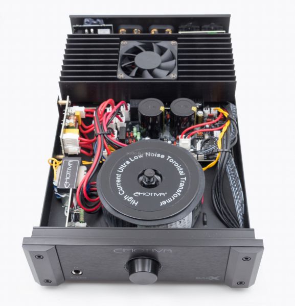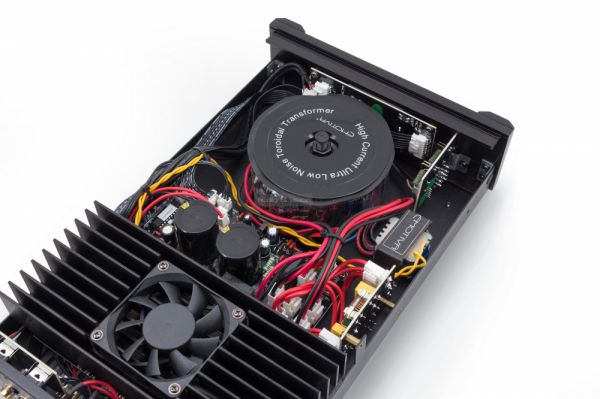 Az előd MiniX-hez képest nem sok minden változott a motortérben. Egy túlméretezett toroid transzformátor, lineáris tápegység, minimálisra redukált jelutak, és egy ventilátorral ellátott méretes hűtőborda igyekszik a lehető legjobb minőségben előállítani a csatornánkénti 50 W-ot (8 ohmon, 80 W 4 ohmon) mindezt 0,05 % alatti THD torzítás mellett, ami több mint ígéretes adat ennél a készüléknél. Hogy miért kell a ventilátor? Mert egy A/B osztályú erősítőről beszélünk, és a kisméretű ház belseje valóban ki lett használva, így nagyobb teljesítményen bizony hajlamossá válik a melegedésre.